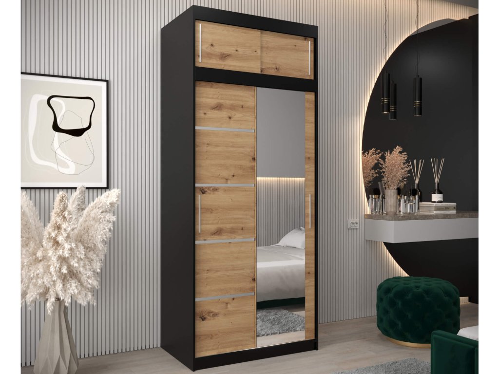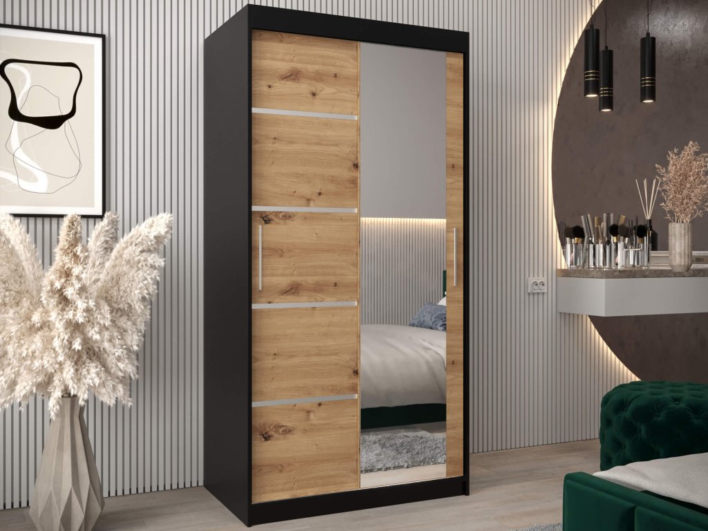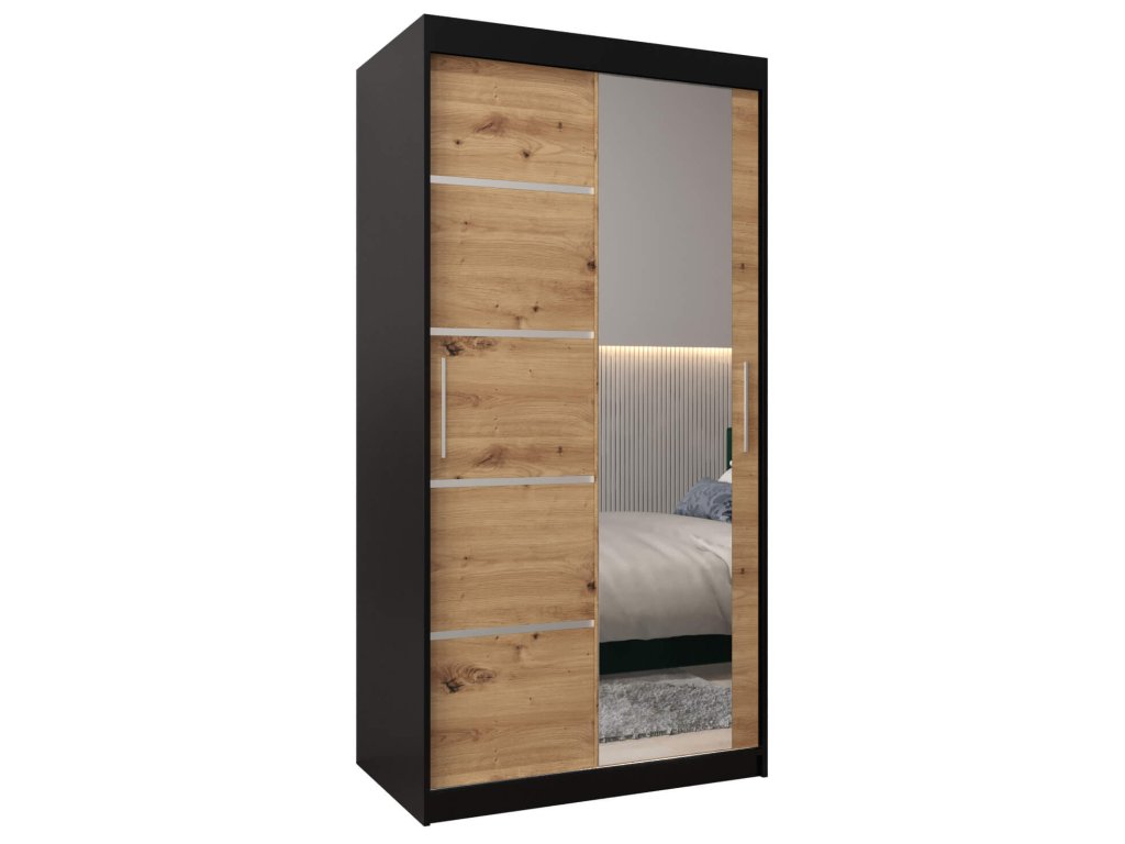 Skriňa so zrkadlom Alyxia II 100/120 v modernej kombinácii čiernej farby s farbou dub artisan. Skriňa je vyrobená z vysoko kvalitnej laminovanej dosky (DTD) o hrúbke 16 mm, ktorá je odolná voči poškriabaniu, vlhkosti a vysokej teplote. Hrany skrine sú upravené kvalitnou PVC dyhou. Použitý je posúvný systém ,,BIMAK“ a hliníkové vodidlá, ktoré Vám zaručia pohodlné otváranie a zatváranie dverí. Vnútorné rozloženie skrine je rozčlenené na dve časti. Pravá strana je tvorená štyrmi policami, ktoré vytvoria päť praktických úložných priestorov a na ľavej strane sa nachádza jedna polička a dve vešiakové tyče. Moderná skriňa vhodná do spálne, chodby či predsiene.