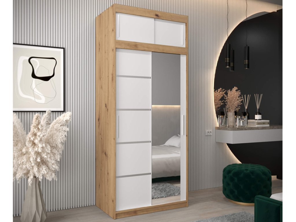 Skriňa so zrkadlom Alyxia II 100/120 (dub artisan / biela) je vyrobená z vysoko kvalitnej laminovanej dosky (DTD) o hrúbke 16 mm, ktorá je odolná voči poškriabaniu, vlhkosti a vysokej teplote. Hrany skrine sú upravené kvalitnou PVC dyhou. Použitý je posúvný systém ,,BIMAK“ a hliníkové vodidlá, ktoré Vám zaručia pohodlné otváranie a zatváranie dverí. Vnútorné rozloženie skrine je rozčlenené na dve časti. Pravá strana je tvorená štyrmi policami, ktoré vytvoria päť praktických úložných priestorov a na ľavej strane sa nachádza jedna polička a dve vešiakové tyče. Moderná skriňa vhodná do spálne, chodby či predsiene.