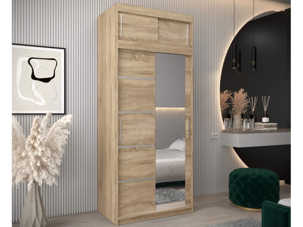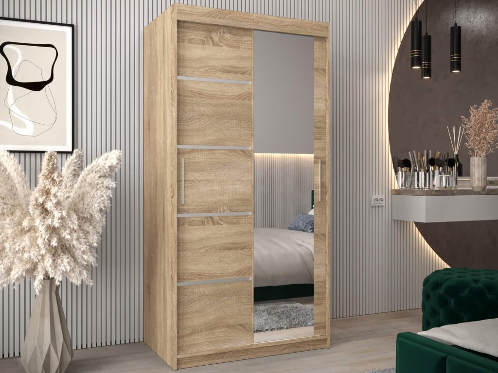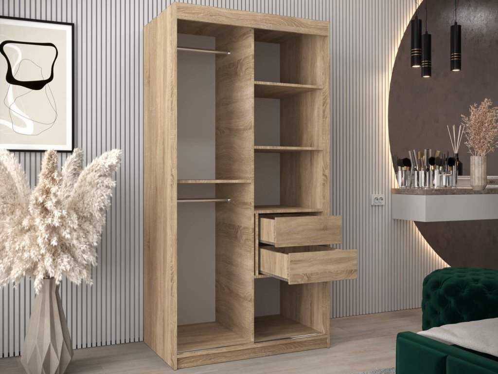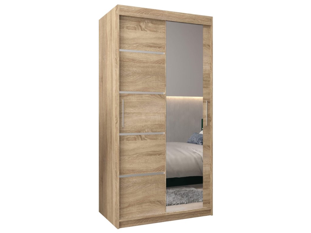 Krásna skriňa Alyxia II 100/120 v nadčasovej farbe dub sonoma je vyrobená z vysoko kvalitnej laminovanej dosky (DTD) o hrúbke 16 mm, ktorá je odolná voči poškriabaniu, vlhkosti a vysokej teplote. Hrany skrine sú upravené kvalitnou PVC dyhou. Použitý je posúvný systém ,,BIMAK“ a hliníkové vodidlá, ktoré Vám zaručia pohodlné otváranie a zatváranie dverí. Vnútorné rozloženie skrine je rozčlenené na dve časti. Pravá strana je tvorená štyrmi policami, ktoré vytvoria päť praktických úložných priestorov a na ľavej strane sa nachádza jedna polička a dve vešiakové tyče. Moderná skriňa vhodná do spálne, chodby či predsiene.