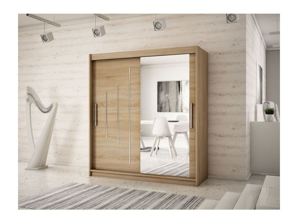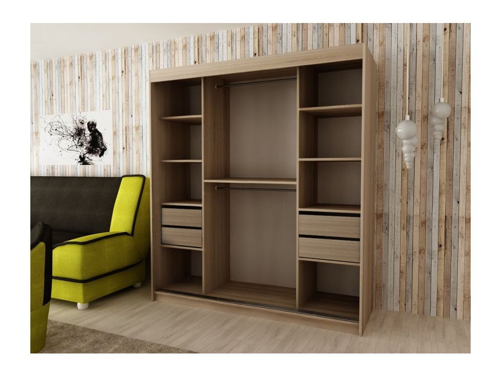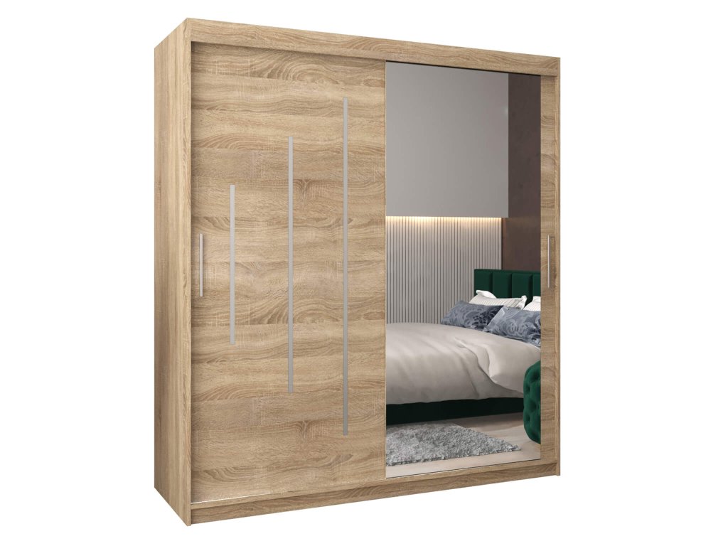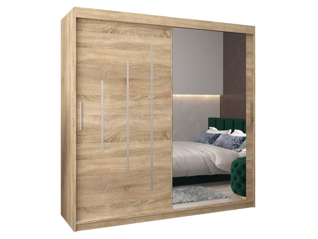 Šatníková skriňa dub sonoma Bethany II je vyrobená z nábytkovej dosky, ktorej hrany sú upravené kvalitnou PVC dyhou. Vďaka posúvnému systému ,,BIMAK“ a hliníkovým vodidlám sa zaručí pohodlné otváranie a zatváranie posuvných dverí. Vnútorné rozloženie je členené na 3 časti. Po stranách sa nachádzajú praktické poličky, štyri na ľavej a štyri na pravej strane, ktoré poskytnú dostatok úložného priestoru. V strede je jedna polica a dve vešiakové tyče, ktoré sú súčasťou skrine.