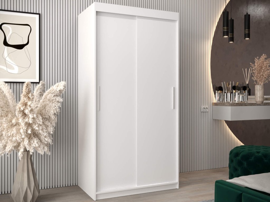 Skriňa z kolekcie Tokyo je model, dostupný vo viacerých farebných prevedeniach. Je vyrobená z kvalitnej laminovanej dosky s hrúbkou 16 mm a hrany sú upravené PVC dyhou. Pohodlné otváranie a zatváranie dverí zabezpečí posuvný systém ,,BIMAK“ na hliníkových koľajkách. Na ľavej strane skrine sa nachádzajú dve vešiakové tyče, ktoré poskytnú dostatok úložného priestoru. Pravú stranu rozdeľujú štyri police, kde si prehľadne uložíte svoje oblečenie.