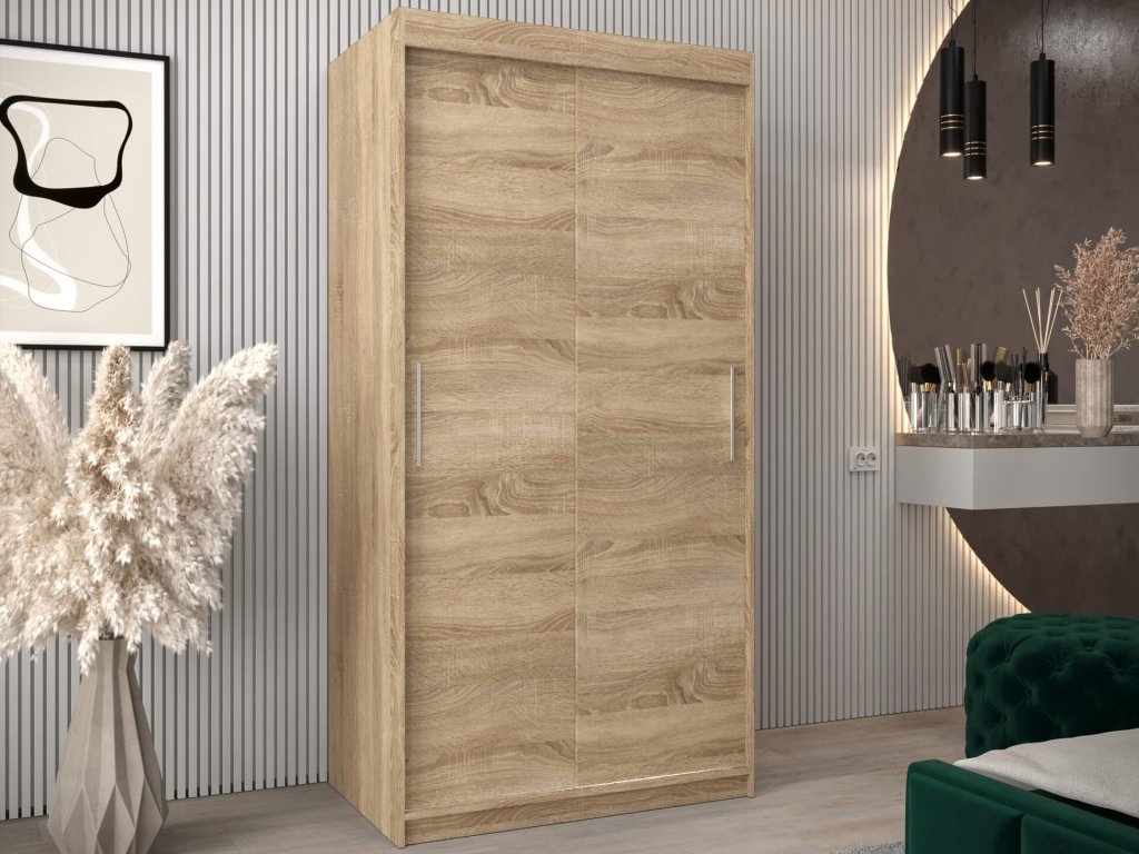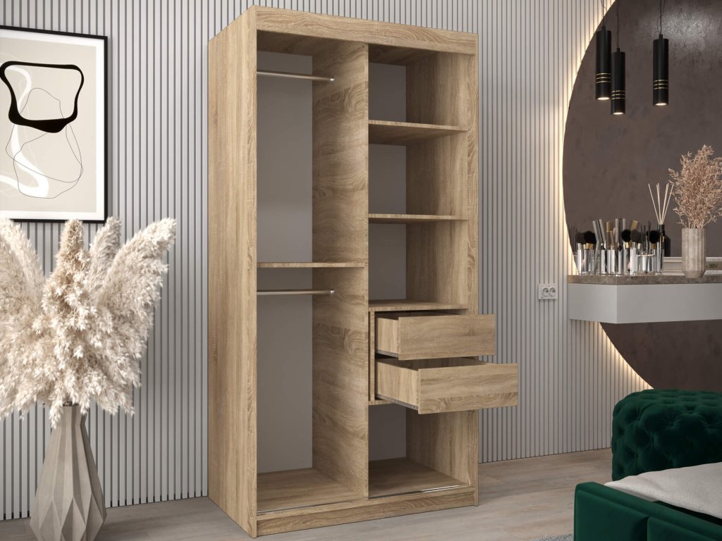 Šatníková skriňa vo vyhotovení so šírkou 100 alebo 120 cm sa vďaka kompaktným rozmerom zmestí aj do menších bytov, na slepý koniec úzkej chodby, ale pokojne aj do rohu spálne. Nezaberie veľa miesta, ale vo vnútri ho vďaka výške až 200 cm ukrýva naozaj dosť. Ak sa vám skriňa páči a máte v byte dostatok priestoru, v ponuke ju máme aj vo vyhotoveniach so šírkou 150, 180, 200 alebo 250 cm. Vďaka štedrej palete rôznych farebných vyhotovení, dekorov a ich kombinácií si svoju vysnívanú skriňu vyberie naozaj každý a bez problémov ju zladíte so zvyškom nábytku, ktorý už doma máte.