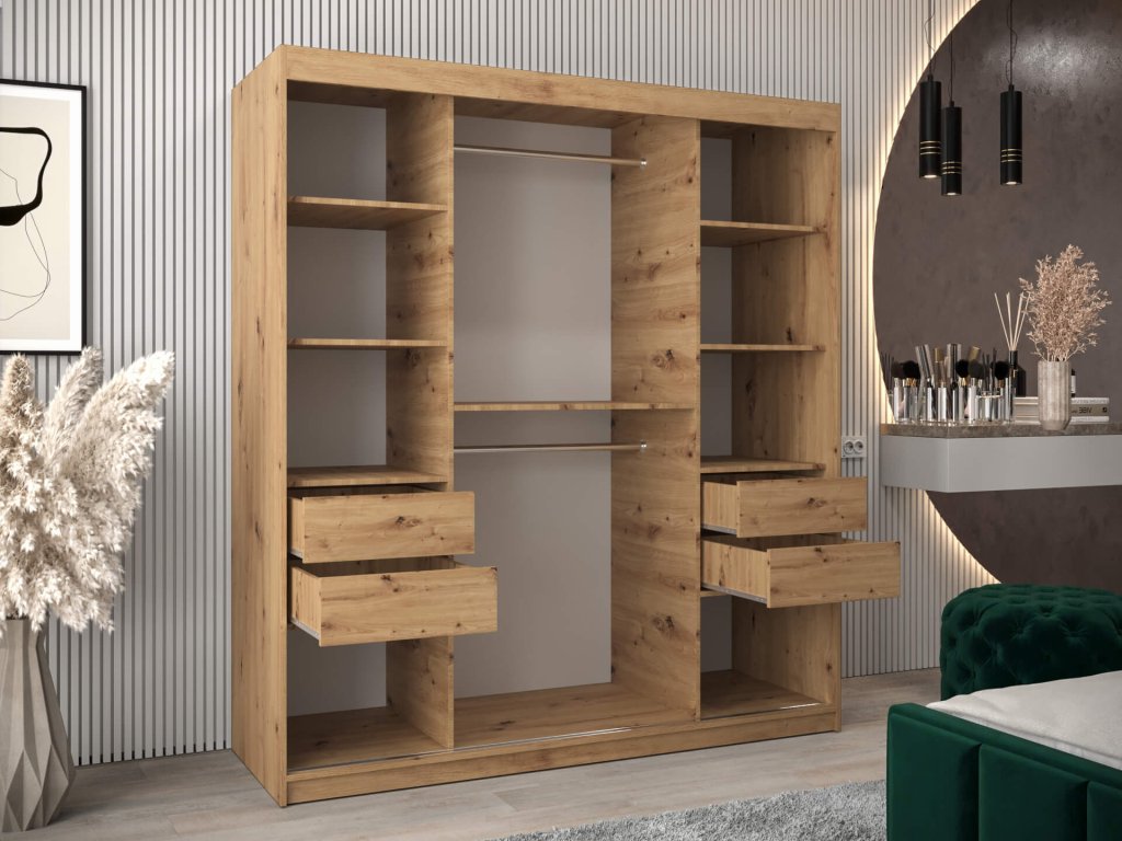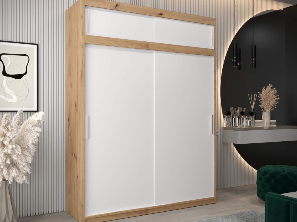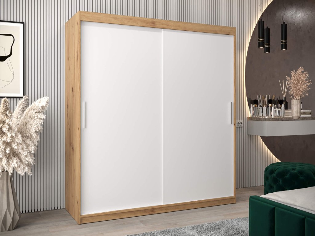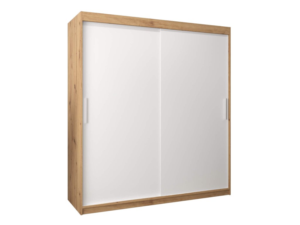Moderná šatníková skriňa Tokyo 180/200 v kombinácii dub artisan s bielou poskytuje množstvo úložného priestoru. Je vyrobená z vysoko kvalitnej laminovanej dosky (DTD) o hrúbke 16 mm, ktorá je odolná voči poškriabaniu, vlhkosti a vysokej teplote. Hrany skrine sú upravené kvalitnou PVC dyhou. Pohodlné otváranie a zatváranie dverí zabezpečí posuvný systém ,,BIMAK“ na hliníkových vodidlách. Skriňa je rozčlenené na tri časti. Po stranách je tvorená štyrmi policami, ktoré vytvoria päť praktických úložných priestorov a v strede sa nachádza jedna polička a dve vešiakové tyče. Skriňa je vhodná do chodby, predsiene aj spálne!