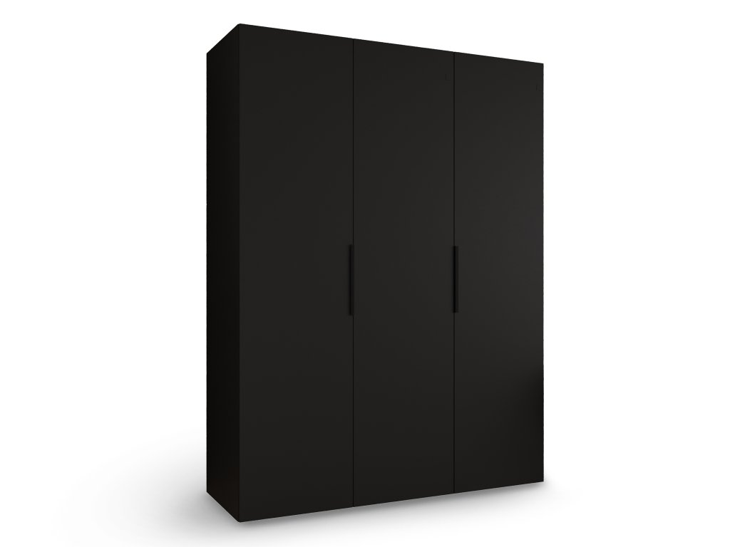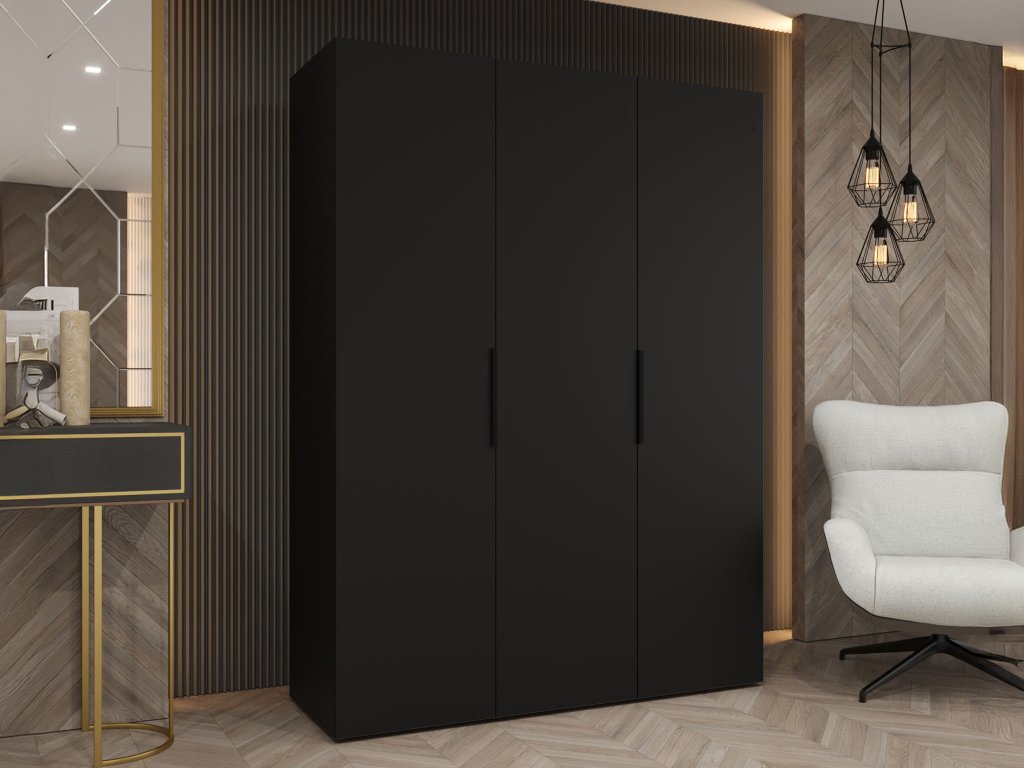 Hľadáte skriňu, ktorá dokonale zapadne do vášho interiéru a ponúka dostatočný priestor? Táto trojdverová skriňa Marbella 1 so šírkou 150 cm vám zabezpečí úložisko v spálni, štýlový doplnok do obývačky, praktické riešenie do predsienie alebo aj do detskej izby. Vo vnútri skrine nájdete robustné kovové tyče, na ktoré si môžete zavesiť svoje šatstvo. Nad tyčami sa nachádzajú pevné police, ideálne na uskladnenie doplnkov. Na dverách skrine sa nachádzajú odolné hliníkové úchytky v čiernej farbe. Aj vďaka zadnej stene vyrobenej z odolnej HDF dosky, má táto šatníková skriňa odolnú konštrukciu. Tak odolná voči každodennému používaniu. Táto čierna skriňa je skvelá investícia do dokonale usporiadaného domova.