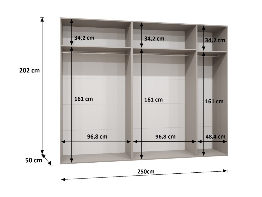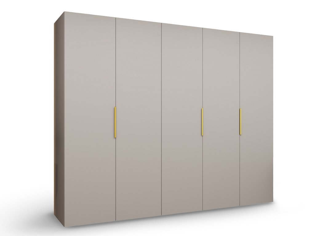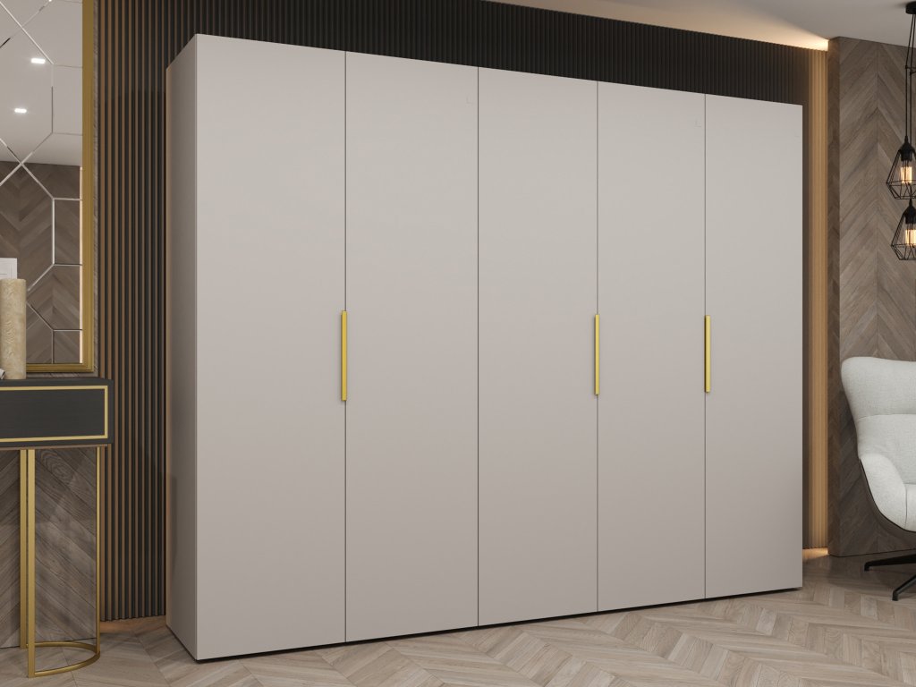 Šatníková skriňa Marbella 1 so šírkou 250 cm pozostáva z dvoch samostatných skríň Marbella 1 100 a 150, ktoré spolu vytvárajú veľkorysý a funkčný úložný systém. Matná kašmírová farba dodáva nábytku sofistikovaný vzhľad, zatiaľ čo zlaté hliníkové úchytky podčiarkujú jeho moderný charakter. Interiér je premyslene členený. Kovové tyče na zavesenie odevov a praktické police na doplnky, úložné boxy či poskladané oblečenie zabezpečia dokonalý prehľad. Vďaka kvalitnej konštrukcii a zadnej stene z odolnej HDF dosky je zaručená stabilita aj dlhá životnosť, a to aj pri každodennom používaní v spálni, v obývačke, v predsieni alebo v detskej izbe.