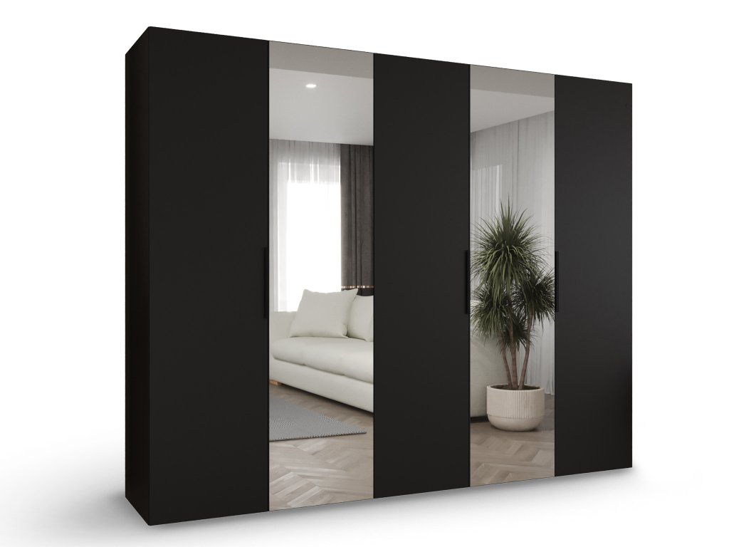 Moderný dizajn, praktický úložný priestor a premyslená zostava. To všetko tvorí Skriňa Marbella 2 250. So svojou šírkou 250 cm a matným čiernym povrchom sa hodí do každého súčasného interiéru. Od spálne cez predsieň až po detskú izbu. Šatníková skriňa je zostavená z dvoch samostatných častí Marbella 2 100 a Marbella 2 150, ktoré spolu tvoria priestranný celok. Za štyrmi dverami nájdete kovové tyče na zavesenie oblečenia, nad nimi pevné police ideálne na doplnky, poskladané veci či boxy. Dvere dopĺňajú veľké zrkadlá, ktoré zároveň opticky zväčšujú priestor. Celkový elegantný dojem dotvárajú čierne hliníkové úchytky, ktoré vkusne kontrastujú s jemne matným povrchom. O stabilitu a životnosť sa stará kvalitná konštrukcia z 16 mm laminovanej dosky, pevná HDF zadná stena a zosilnené PVC hrany, ktoré chránia skriňu pred každodenným opotrebovaním.