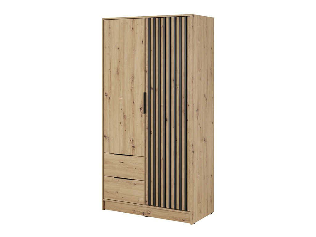 Šatníková skriňa Nelly 2D je praktická a priestranná so zaujímavým moderným dizajnom. Dvojdverová skriňa vyrobená z laminovanej dosky s hrúbkou 16 mm, má plastové čierne úchytky a na pravých dvierkach dekoračné lamely v čiernom prevedení. Za pravými dvierkami sú uložené police, kde si môžete uložiť oblečenie ale aj veci každodennej potreby. Na ľavej strane je vešiaková tyč pod ktorou sú 2 priestranné zásuvky.
