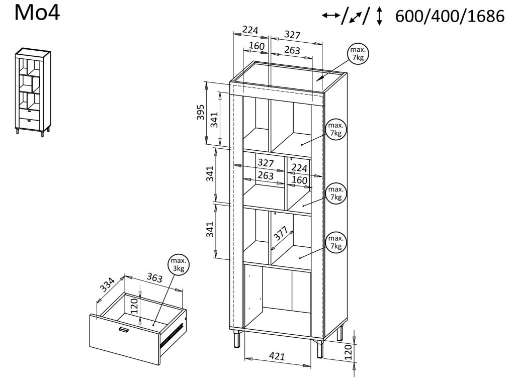 - Regál Mossa 04 - zaujímavý a praktický úložný priestor ktorý môže slúžiť aj ako výstavný priestor pre vaše obľúbené predmety. Rozmery (šxvxh): 60 x 168,6 x 40 cm