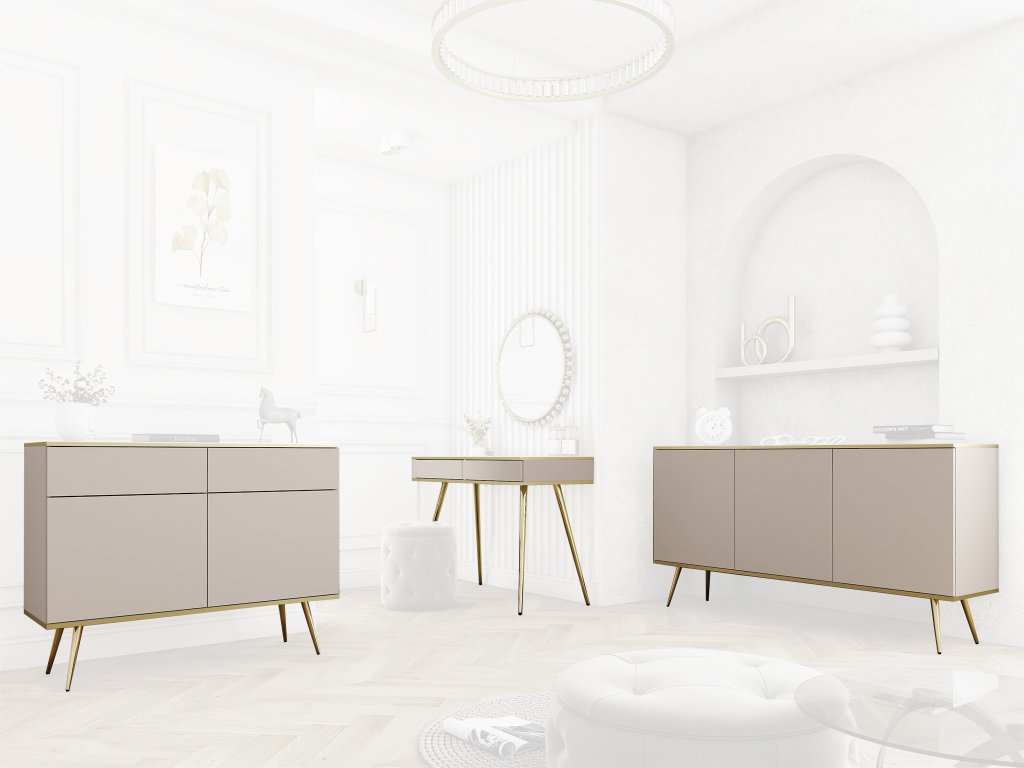 - Široká komoda Orique - kašmír: Komoda ORIQUE v kašmírovej farbe so zlatými detailmi prináša do interiéru moderný luxus, čisté línie a elegantný glamour vzhľad. Rozmery (šxvxh): 160 x 85 x 39 cm