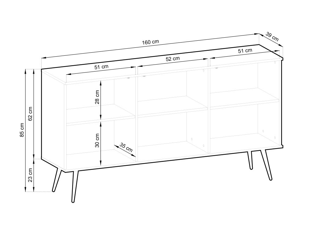 - Materiál: laminovaná doska DTD, ABS hrany, kovové nohy, guľôčkové výsuvy