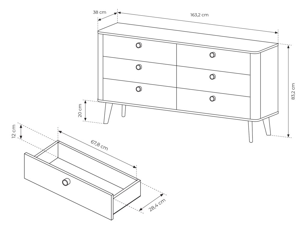 - Komoda Viki 6S poskytuje šesť priestranných zásuviek v minimalistickom dizajne so zaoblenými hranami a drevenými úchytkami v moka odtieni. Rozmery (šxvxd): 163,2 x 83,2 x 38 cm