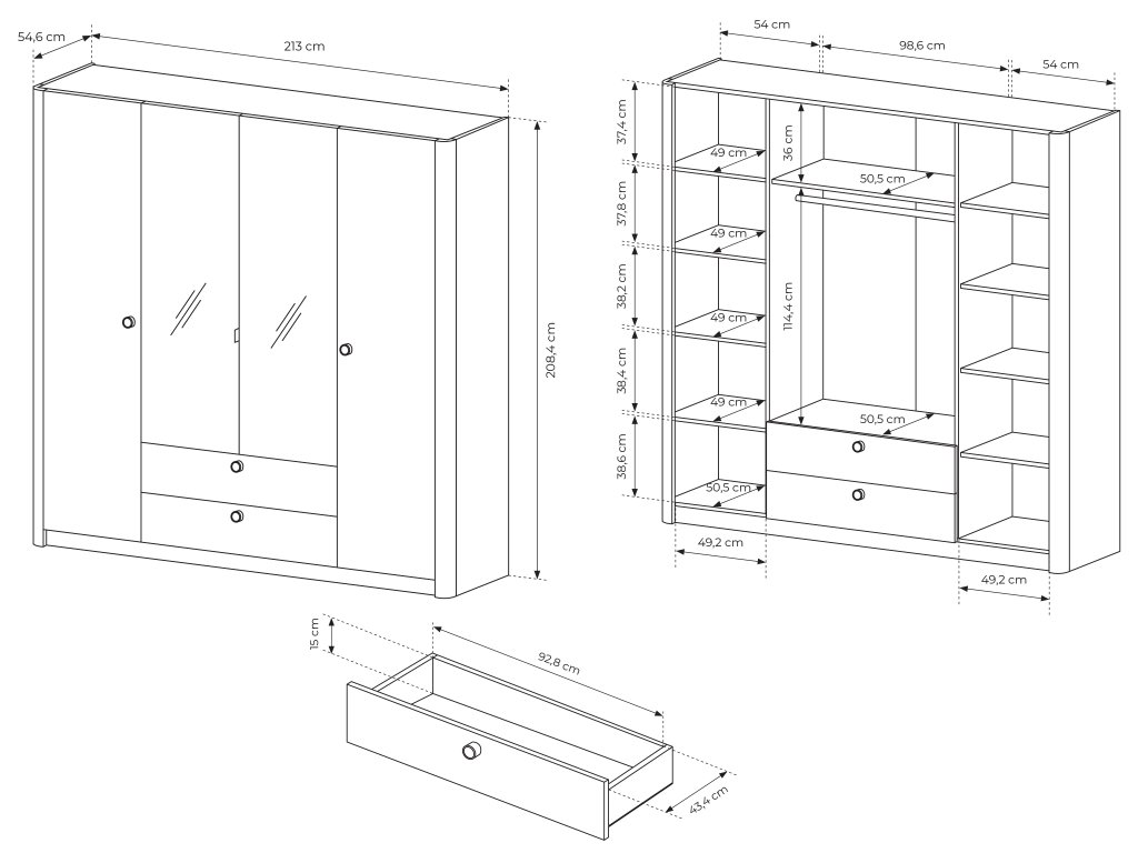 - Šatníková skriňa Viki 4D2S zaujme priestranným úložným priestorom, veľkým zrkadlom a jemne zaoblenými detailmi. Rozmery (šxvxh): 213 x 208,4 x 54,6 cm