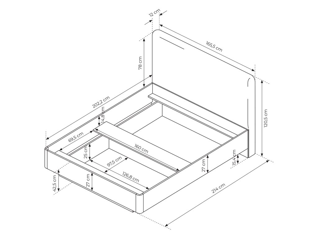 - Manželská posteľ Viki s čalúneným čelom a úložným priestorom ponúka elegantný škandinávsky vzhľad. Rozmery (šxvxd): 165,5 x 120,5 x 214 cm