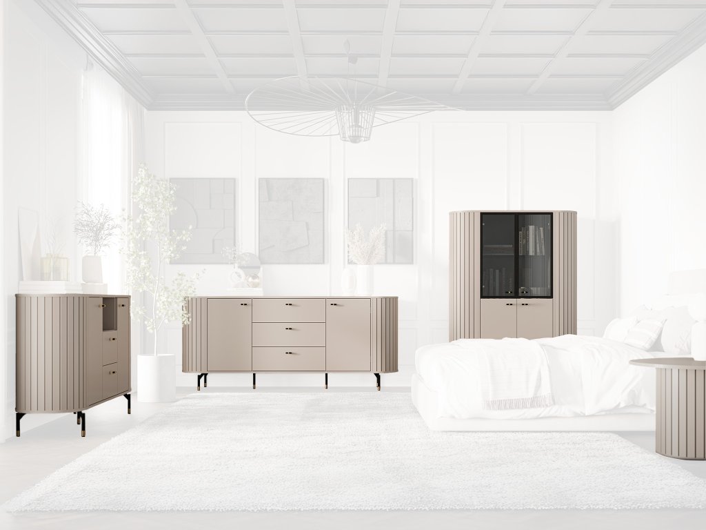Spalňová zostava ZANTE obsahuje štyri kusy nábytku: sklenenú vitrínu, dve komody a konferenčný stolík menšej veľkosti.