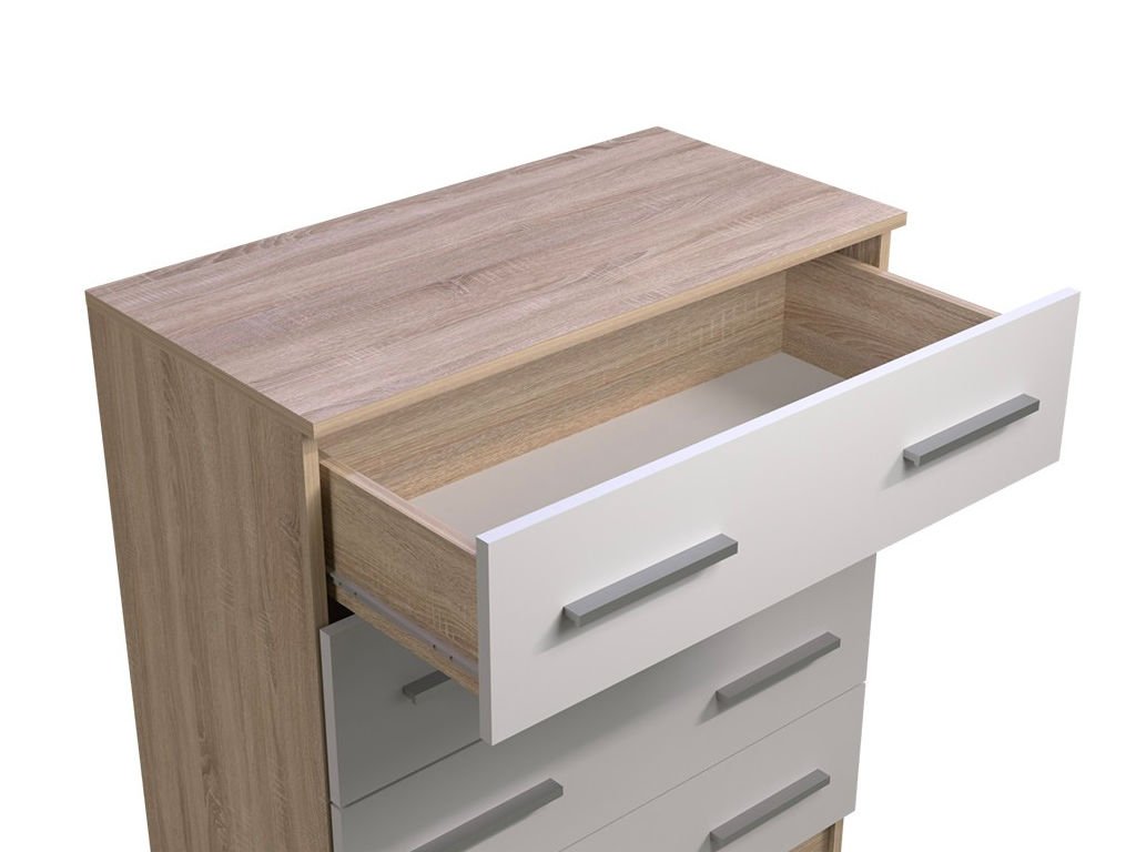 - Komoda je tvorená štyrmi zásuvkami, ktoré majú hliníkové úchyty. Rozmer (šxvxh): 80 x 93 x 40 cm