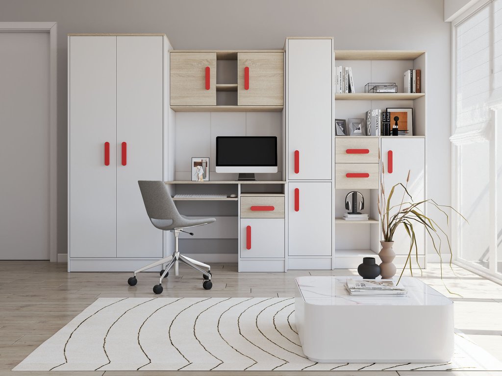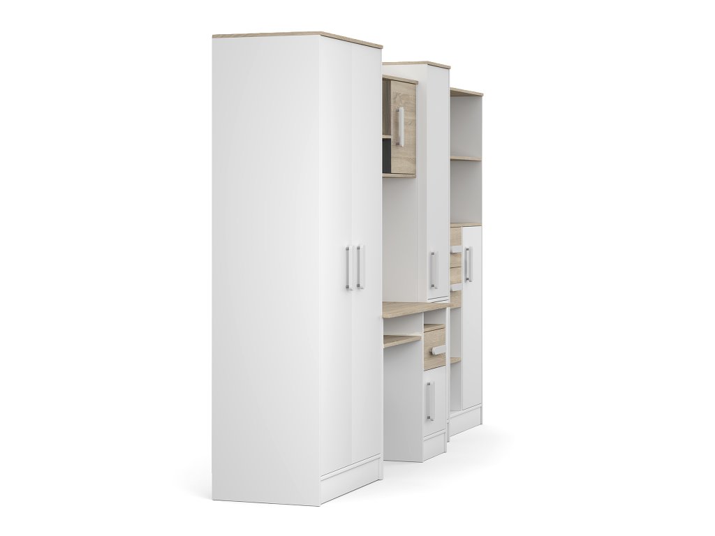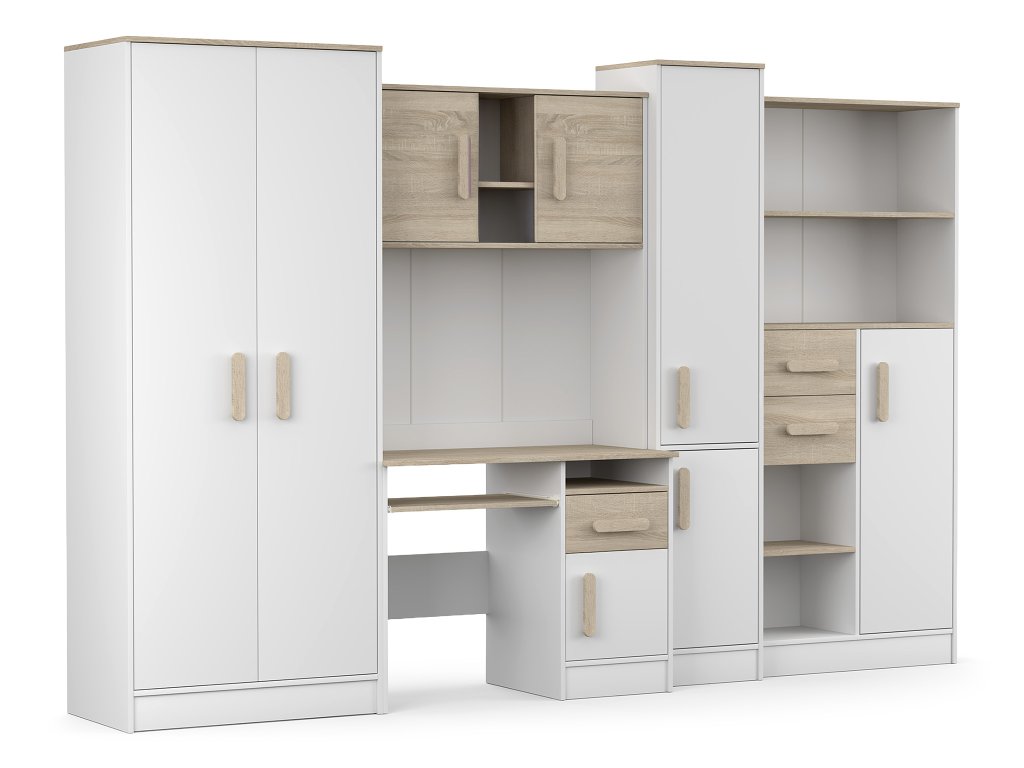 Študentská izba Markus sa skladá z 5 ks nábytku: písacieho stola, šatníkovej skrine, 2 ks regálov a police nad písací stôl. Každý prvok súpravy je samostatný, takže môžete detskú izbu zariadiť v akejkoľvek kombinácii.