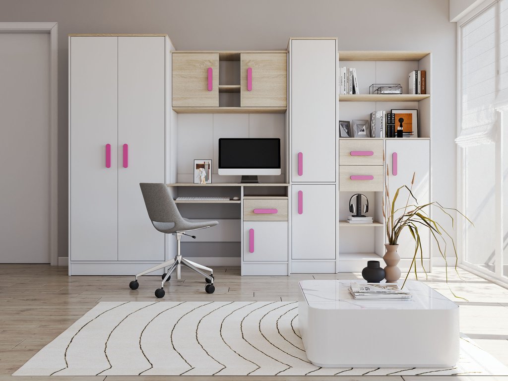 Detská / študentská izba neobsahuje farebné úchytky. Úchytky je potrebné dokúpiť osobitne. Farbu úchytkov si vyberáte podľa vlastného vkusu, tak ako vám to vyhovuje. Potrebných je 11 ks úchytiek. Farby na nábytku dodajú detskej izbe veselosť a farebnosť.