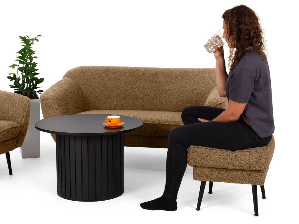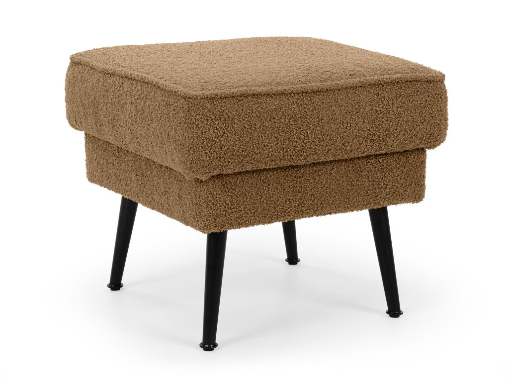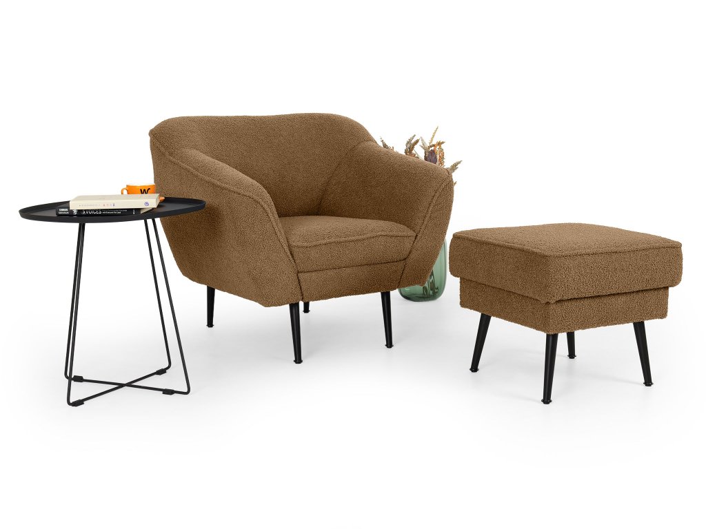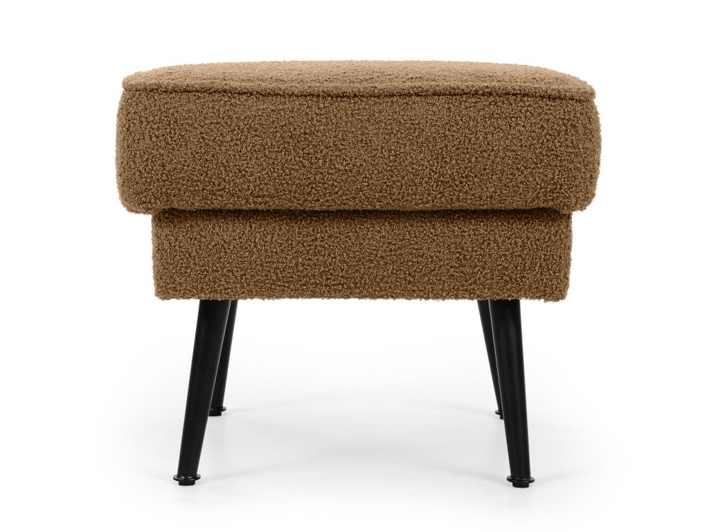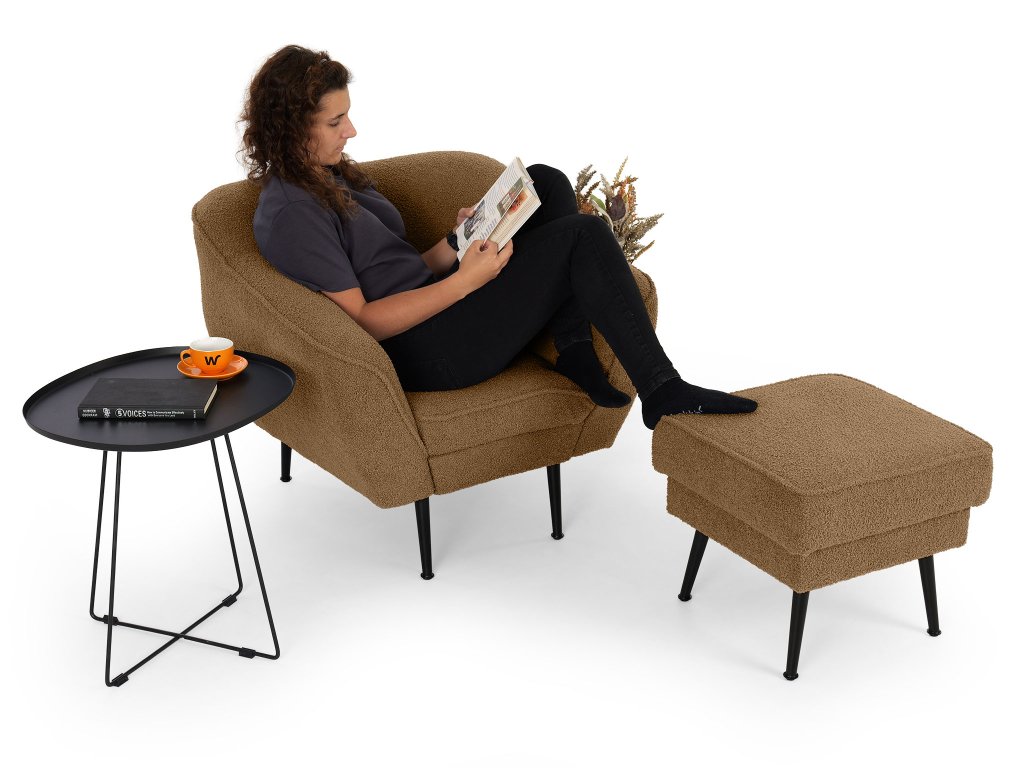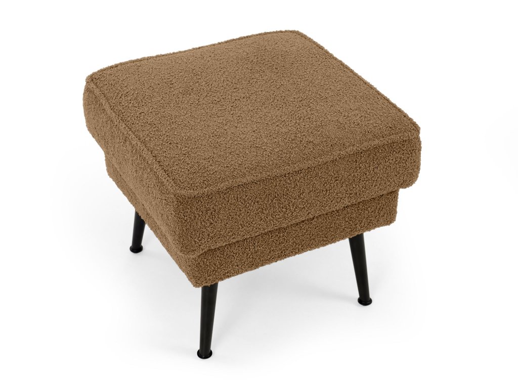 Dodajte svojej obývačke hrejivý, zemitý akcent s taburetom Bowy v sýtom škoricovom (terakotovom) prevedení. Tento kus nábytku je stvorený na to, aby priniesol škandinávsky štýl s prvkami tepla a útulnosti. Je potiahnutý populárnou buklé látkou Now or Never, ktorej jedinečná štruktúra v hnedooranžových tónoch okamžite upúta pozornosť a láka k dotyku. Taburet je postavený na pevných čiernych kovových nohách, ktoré vytvárajú moderný kontrast k mäkkej látke a zabezpečujú výbornú stabilitu. Využijete ho nielen ako pohodlnú podložku pre unavené nohy, ale aj ako praktický príručný stolík či príležitostné sedenie, kedykoľvek je to potrebné.