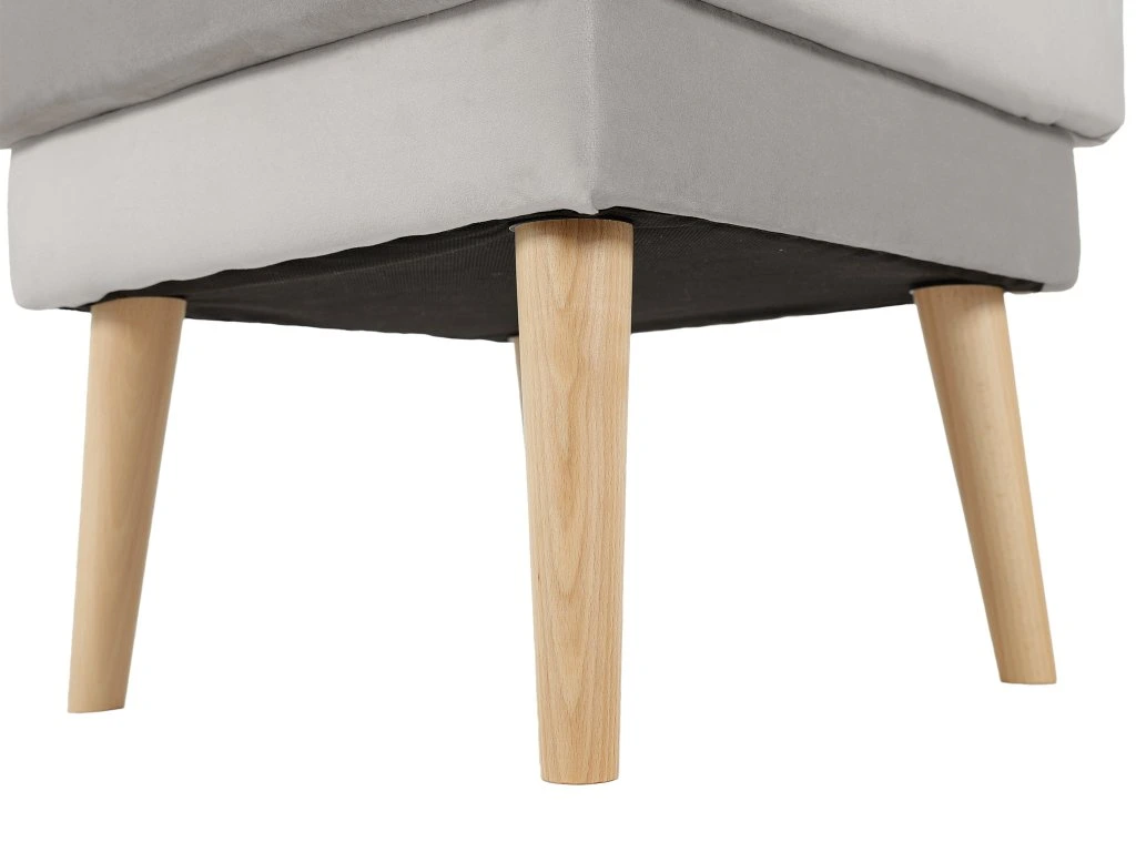 Výplň z peny T30 zabezpečuje komfortné sedenie a tvarovú stálosť. Látka Velur Royal pôsobí hebko, je trvácna a odolná voči žmolkovaniu aj oderu. Drevené nožičky z masívu zdôrazňujú stabilitu a podčiarkujú škandinávsky charakter.