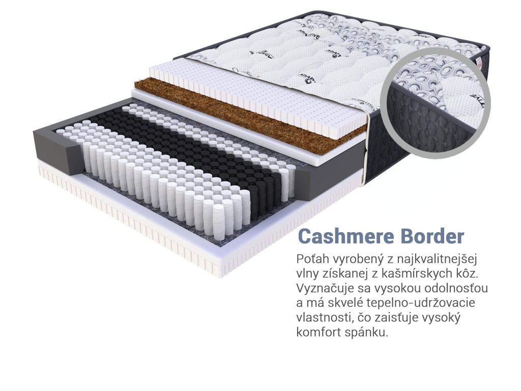 Matrac má exkluzívny poťah Cashmere Border. Tento poťah je vyrobený z najkvalitnejšej vlny z kašmírskych kôz. Poťah je odolný, pružný a veľmi príjemný na dotyk. Navyše má skvelé tepelno-udržiavacie vlastnosti čo zaisťuje vysoký komfort pri spánku. Poťah nie je odnímateľný. Vďaka výrobnej technológií aktívnych probiotík Purotex® je poťah antialergický, vzdušný a odolný voči nečistotám a rozťahovaniu.
