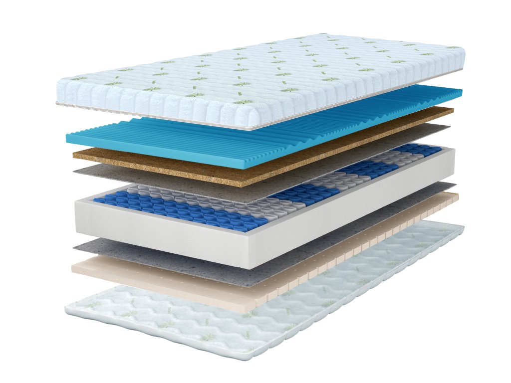 Materiálové zloženie: Filc, NanoHARD taštičkové pružiny, Kokosová vrstva, Polyuretánová PUR pena T25 (4cm), Latex (3cm) Poťah