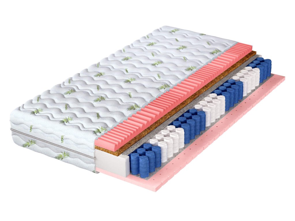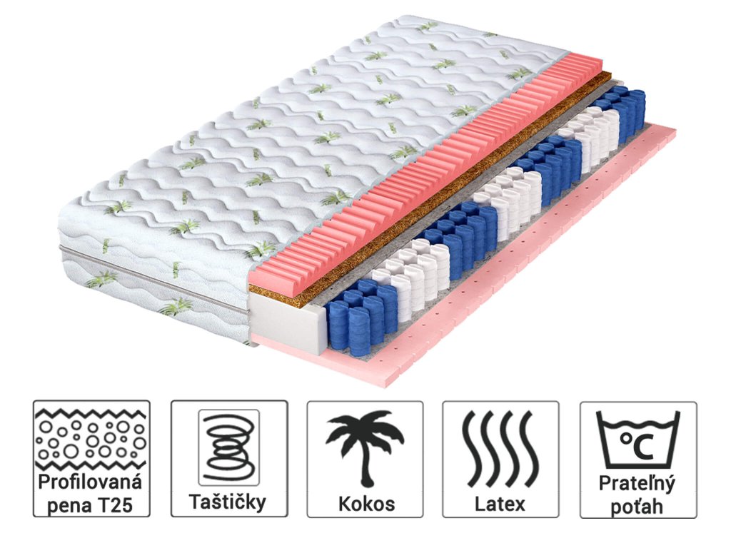Materiálové zloženie: Filc, NanoHARD taštičkové pružiny, Kokosová vrstva, Polyuretánová PUR pena T25 (4cm), Latex (3cm) Poťah