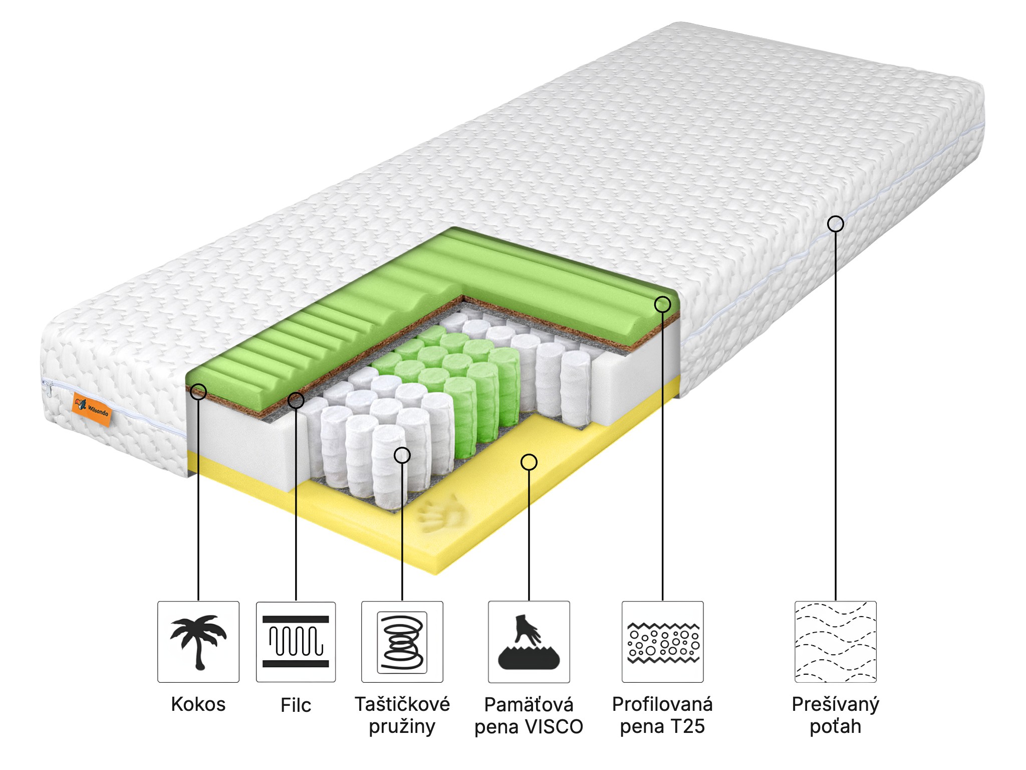 Materiálové zloženie: taštičkové pružiny (7 zón), plstená podložka, kokosová doska 1 cm, polyuretánová pena T25, visco pamäťová pena