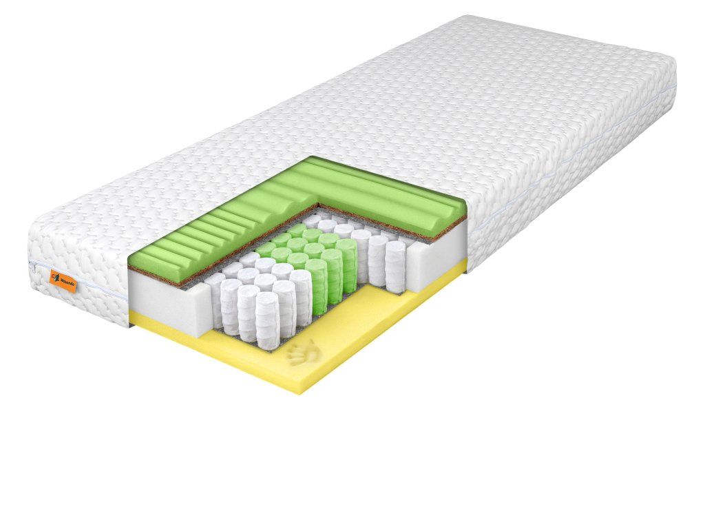 Materiálové zloženie: taštičkové pružiny (7 zón), plstená podložka, kokosová doska 1 cm, polyuretánová pena T25, visco pamäťová pena