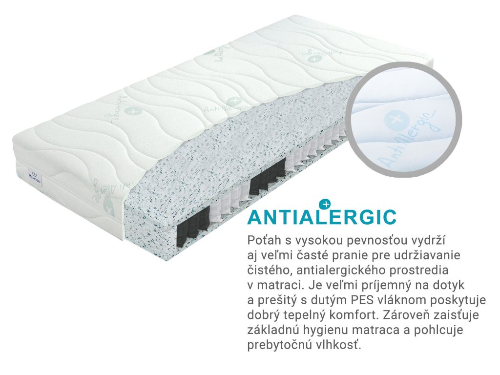 Obojstranný matrac má antialergický poťah na zips, ktorý znesie aj časté pranie v práčke. Tento poťah má antialergické a antibakteriálne vlastnosti, vďaka čomu je ideálny pre alergikov. Je príjemný na dotyk a prešitie dutým PES vláknom zabezpečuje tepelný komfort, hygienu matraca a absorpciu vlhkosti.
