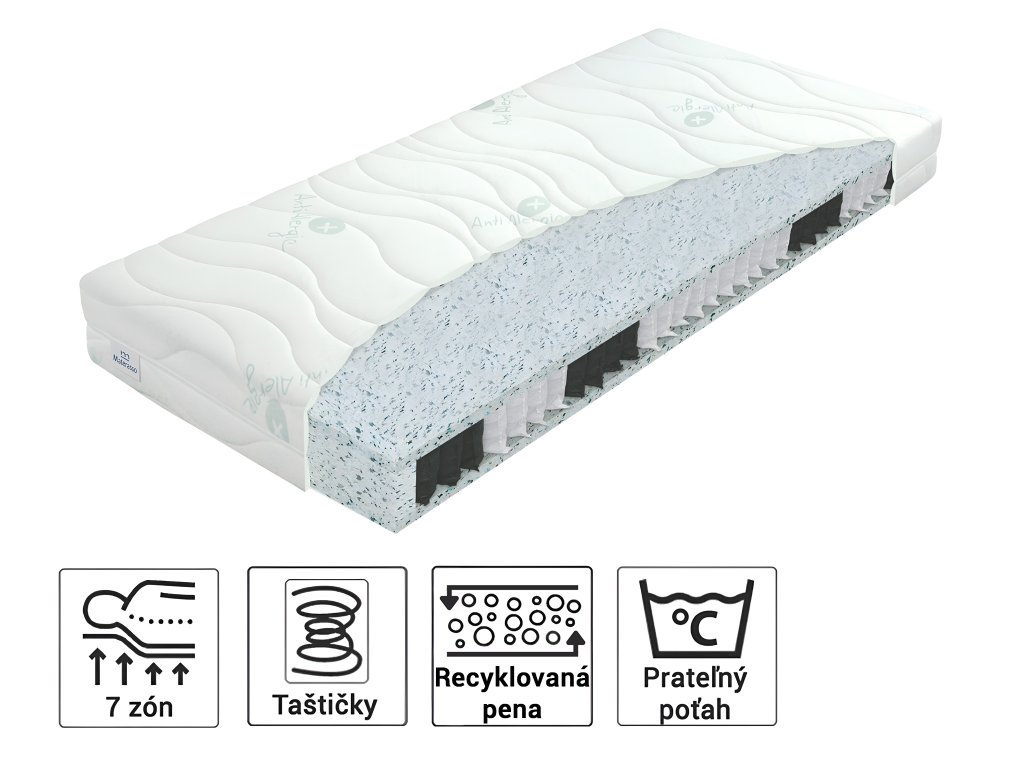 Materiálové zloženie: Taštičkové pružiny, ECO pena, odzipsovateľný antialergický poťah prešitý s PES vláknom s hustotou 200 g/m2