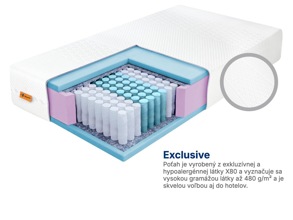 Matrac má odnímateľný a prateľný poťah s názvom Exclusive, ktorý udržuje čistotu a zdravé prostredie na spanie. Poťah je vyrobený v EÚ a spĺňa všetky platné normy a požiadavky trhu. Nezabudnite si tiež prečítať náš článok: Ako správne prať poťah na matrac?, aby ste zachovali jeho kvalitu a hygienu čo najdlhšie.