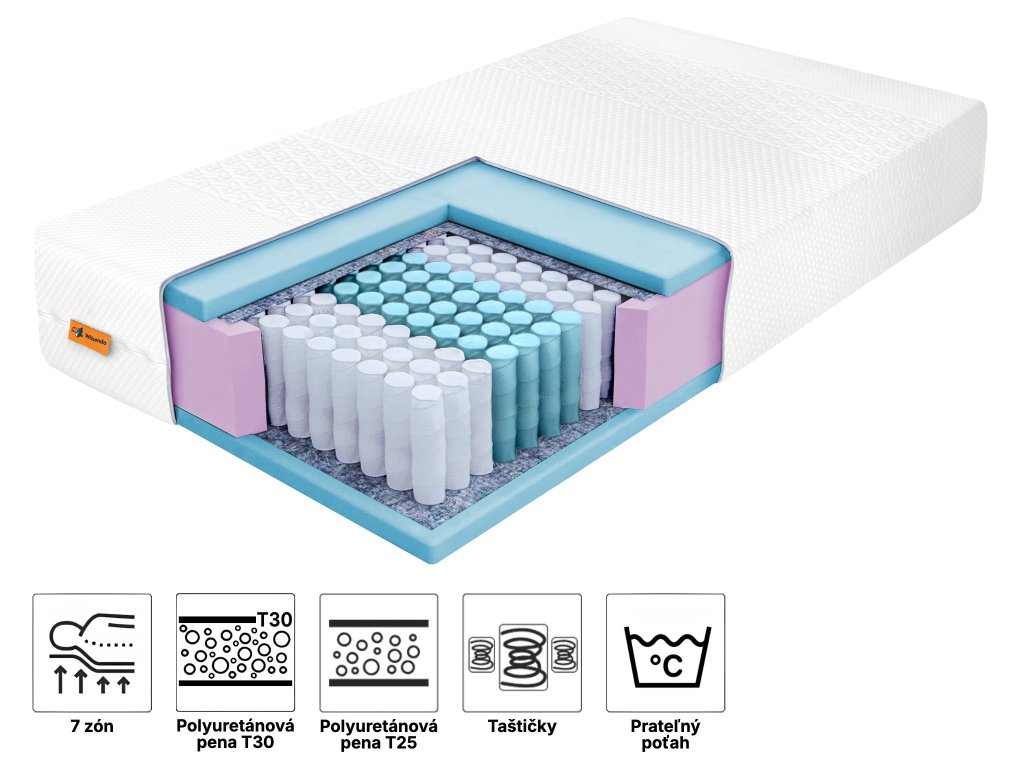 Materiálové zloženie: Filc, Taštičkové multipocket pružiny, Polyuretánová pena s hustotou 25 kg/m3, Polyuretánová pena s hustotou 30 kg/m3 Poťah