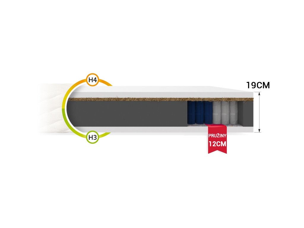Materiálové zloženie: Filc, NanoHARD taštičkové pružiny, Polyuretánová PUR pena s hustotou 25 kg/m3, Poťah, Kokosová vrstva
