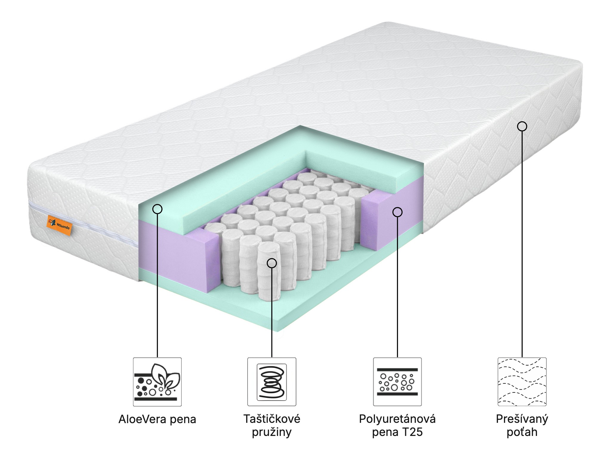Materiálové zloženie: pena AloeVera, taštičkové pružiny, filc, poťah Matrix