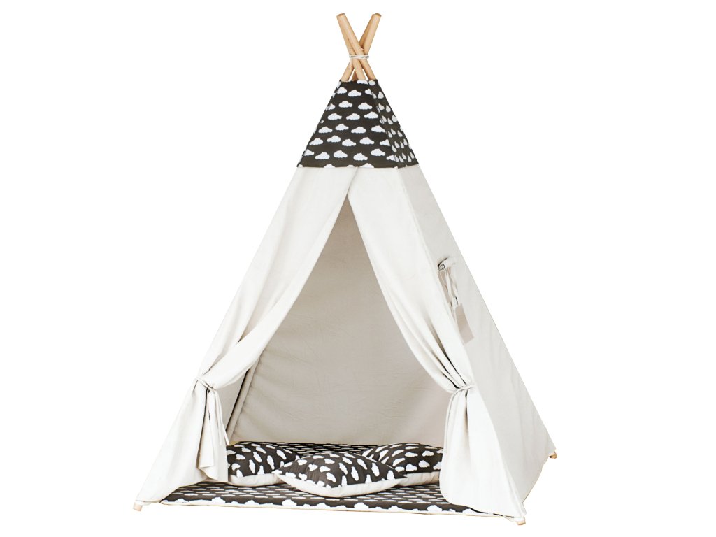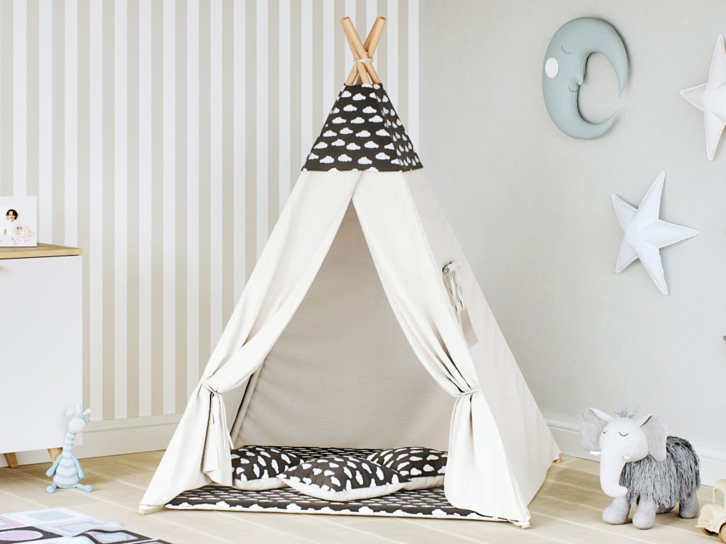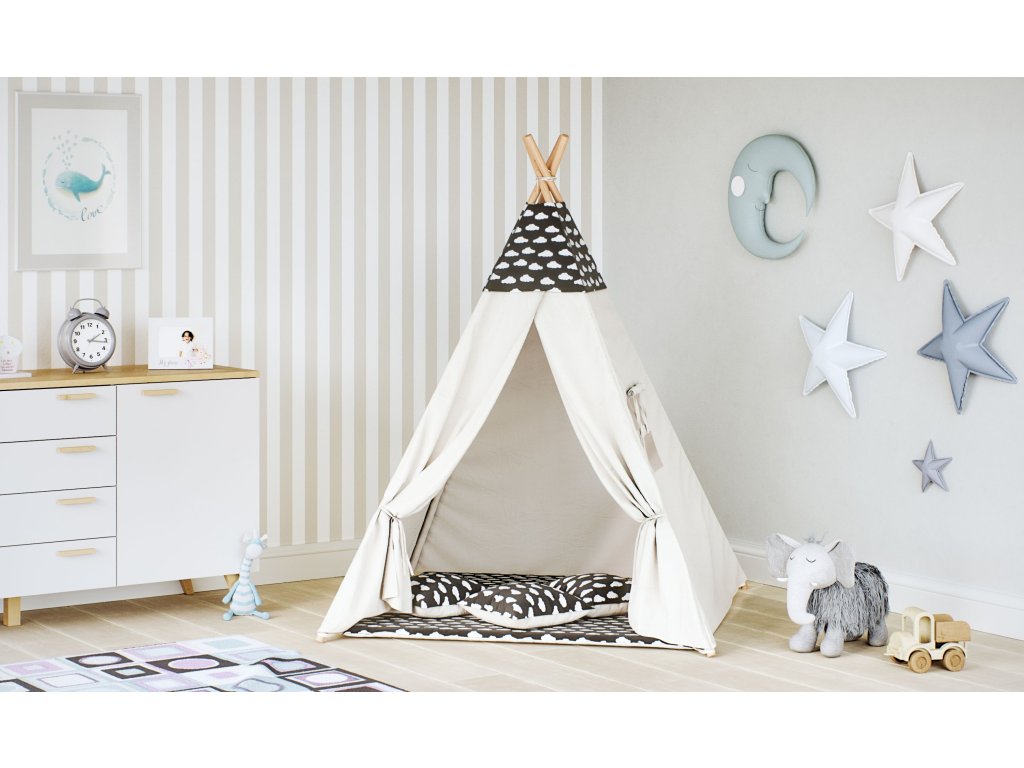 Detský teepee stan môžete využívať nielen v interiéri, alej aj vonku alebo na terase. Stan je ľahký a jednoducho zložiteľný, môžete si ho vziať kamkoľvek. Stany sú u detí veľmi obľúbené, môžu sa v ňom hrať, vystrájať alebo len tak odpočívať. Rám sa skladá zo 4 tyčí s priemerom 22 mm a dĺžkou 180 cm. Súčasťou sady je aj praktická podložka, ktorá izoluje od studenej zeme, čo zvyšuje komfort hry. Podložka nie je pevne pripevnená k stanu. Vankúše a okno so závesom poskytnú malým prieskumníkom skvelú zábavu. Látka teepee stanu sa dá prať ručne do 30 stupňov, nie je vhodné používať agresívne čistiace prostriedky.