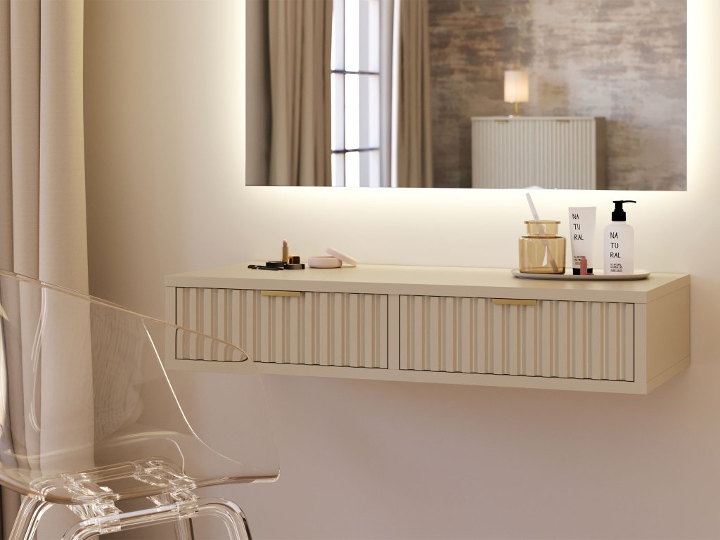 Závesný kozmetický stolík Lumina v kašmírovom odtieni prináša do interiéru harmóniu jemných farieb a premyslenej funkčnosti. Je navrhnutý pre ženy, ktoré ocenia nielen praktické úložné riešenia, ale aj estetiku čistých línií a detailov. Ryhovaná čelná plocha v kombinácii so zlatými úchytkami dodáva stolíku sofistikovaný charakter, zatiaľ čo beznožičková, závesná forma vytvára ľahký a vzdušný dojem. Lumina sa prirodzene začlení do modernej spálne či šatníka a poskytne štýlové miesto pre každodenné kozmetické rituály – bez kompromisov medzi dizajnom a funkčnosťou.
