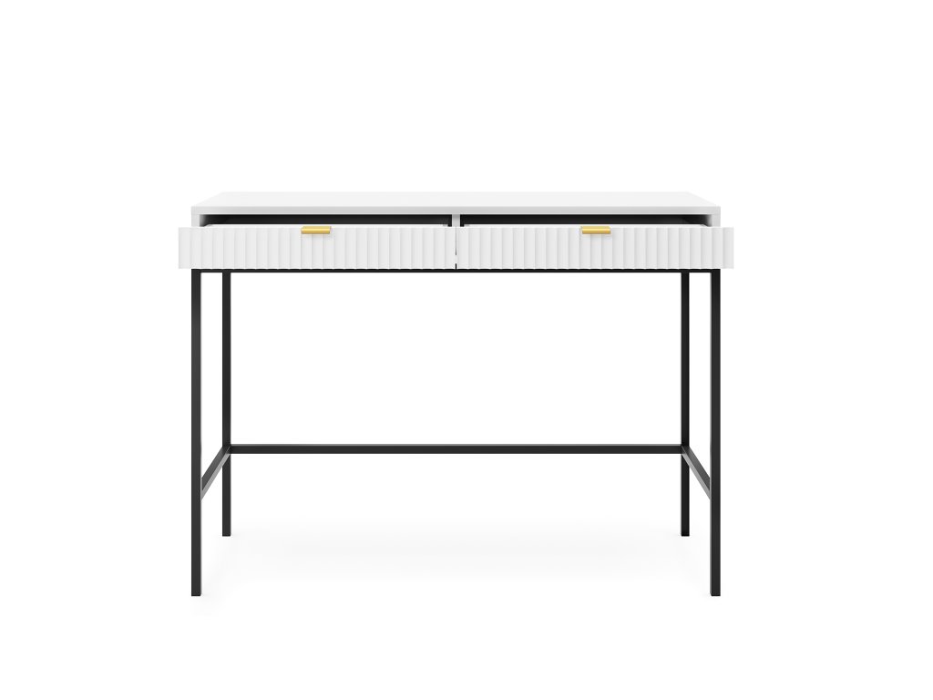 Biely toaletný stolík Nova T104 je elegantným a praktickým doplnkom do modernej spálne alebo pracovne. Ozdobné drážkované čelá ladia s brúsenými zlatými úchytkami z hliníka, čo stolíku dodáva štýlový a nadčasový vzhľad. Ľahkosť a vzdušnosť stolíka podčiarkuje čierna kovová konštrukcia s vysokými nožičkami, ktorá zároveň uľahčuje údržbu a dodáva stolíku moderný charakter. Korpus stolíka je vyrobený z laminovanej DTD dosky, zatiaľ čo drážkované čelá z kvalitnej MDF zabezpečujú pevnosť a dlhú životnosť. Stolík Nova T104 ponúka praktický úložný priestor – dve zásuvky, do ktorých si pohodlne uložíte všetky drobnosti a príslušenstvo, čím budete mať vždy poriadok a všetko po ruke. Vďaka svojmu univerzálnemu dizajnu môže poslúžiť nielen ako toaletný stolík do spálne, ale aj ako konzolový stolík v obývačke či pracovni.