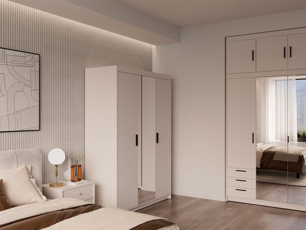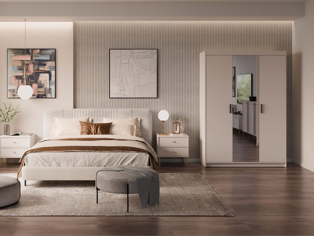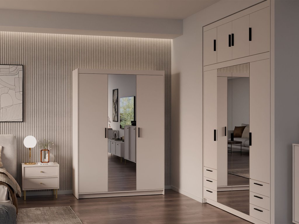 Hľadáte štýlový spôsob, ako opticky presvetliť svoju spálňu a zároveň získať dostatok miesta na oblečenie? Trojdverová šatníková skriňa so zrkadlom Elenas v pieskovom prevedení je praktickým a elegantným riešením do spálne, študentskej izby či predsiene. Jemný pieskový odtieň pôsobí moderne a útulne, pričom opticky zjemňuje a rozjasňuje priestor. Skriňa poskytuje dostatok úložného priestoru na oblečenie, kabáty, šaty či menšie doplnky a vďaka premyslenému vnútornému členeniu je usporiadanie vždy prehľadné a pohodlné.