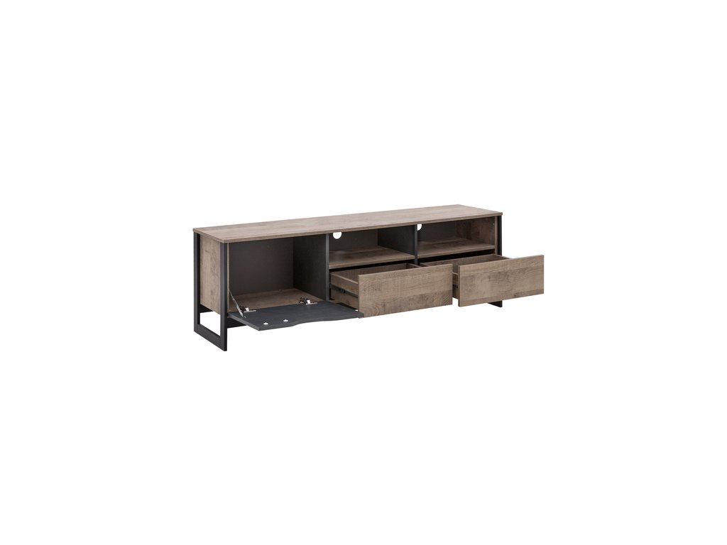 TV stolík Bergen je tvorený dvoma otvorenými policami, dvoma zásuvkami a jednými dvierkami, za ktorými sa nachádza priehradka.