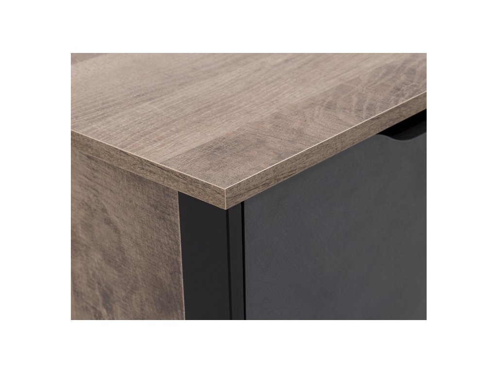 Nábytok z kolekcie BERGEN v modernom industriálnom štýle vdýchne Vášmu interiéru jedinečnosť. Nábytok je vyrobený z vysoko kvalitnej laminovanej dosky (DTD) o hrúbke 16 mm, ktorá je odolná voči poškriabaniu, vlhkosti a vysokej teplote. Nábytok sa vyznačuje kvalitnými ABS hranami, bezúchytovým systémom, otváranie skriniek pomocou ozdobných výrezov. Nábytok je vyhotovený vo farbe dubového dreva s jemne poškriabaným tmavošedým kovom, ktorý dodá interiéru jedinečnú atmosféru podkrovia. Celý povrch je zvýraznený čiernym rámom z prírodnej preglejky. Celá kolekcia pozostáva z viacerých komponentov, ktoré si môžete vyskladať podľa vlastných predstáv.