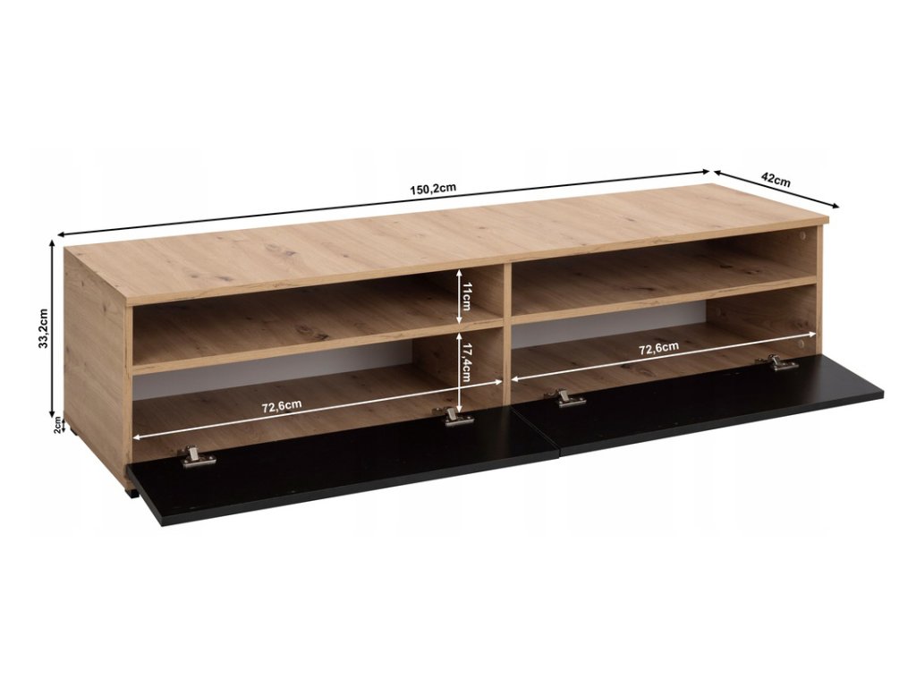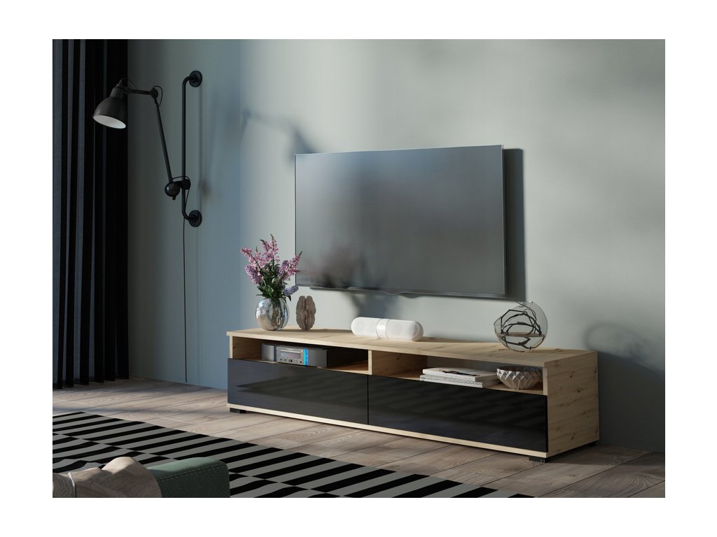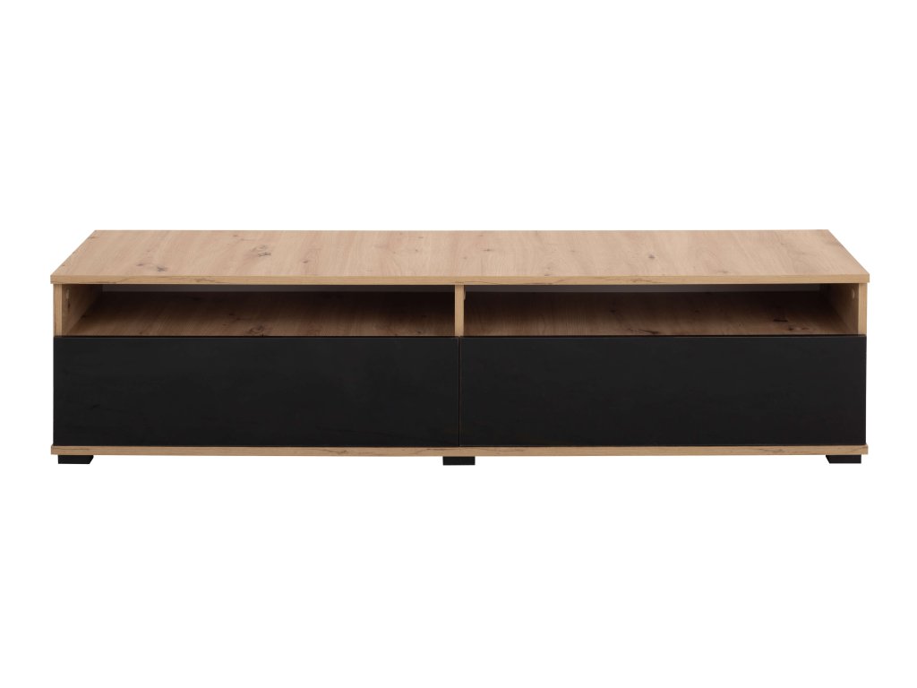 Elegantný a moderný TV stolík Emar 150 vo farbe dub artisan s lesklými čiernymi čelami sa hodí nielen do obývačky, ale aj do detskej či študentskej izby. Televízny stolík je vyrobený z vysoko kvalitnej laminovanej dosky (DTD) o hrúbke 16 mm, ktorá je odolná voči poškriabaniu, vlhkosti a vysokej teplote. Hrany sú upravené kvalitnou PVC dyhou. Lesklé čelá dosiek dodávajú skrinke eleganciu a jedinečný štýl. Stolík je tvorený dvoma otvorenými policami a dvoma dvierkami, za ktorými sa nachádza praktická priehradka. Poskytuje dostatok úložného priestoru na odkladanie audio/video zariadenia, diaľkových ovládačov a iných drobností.