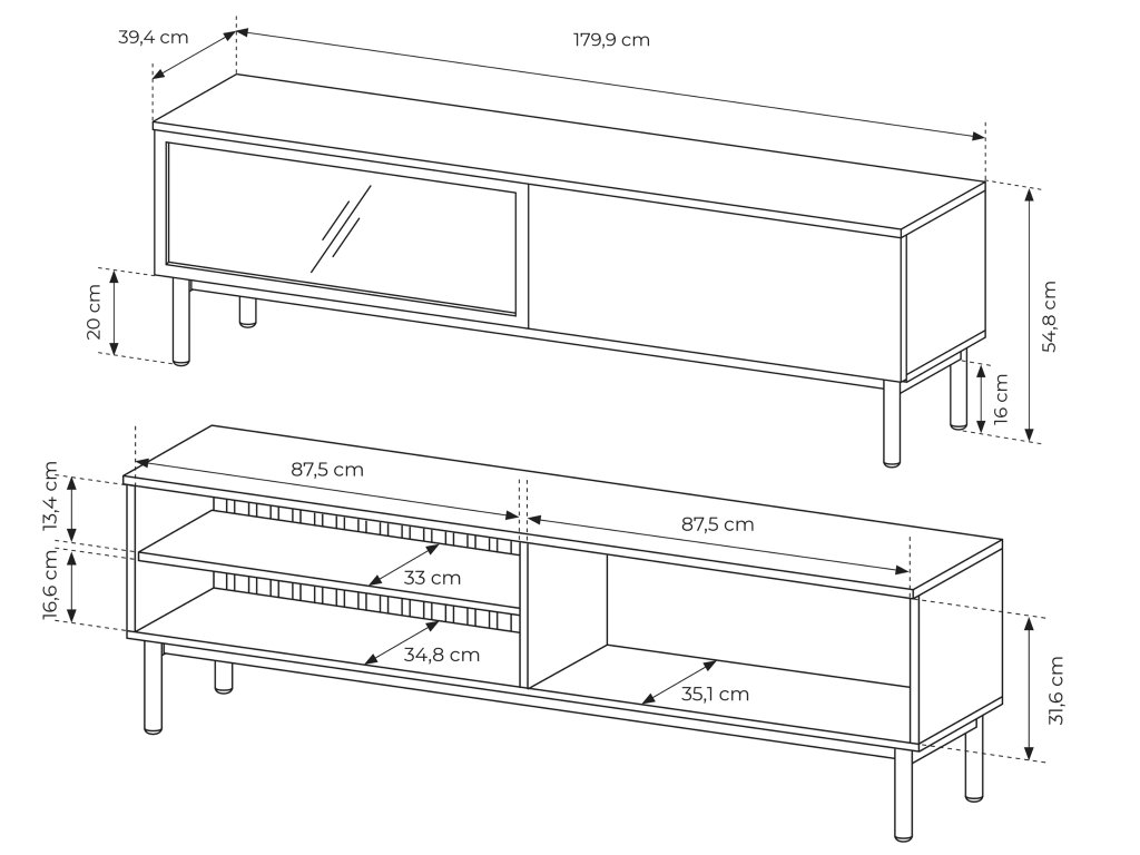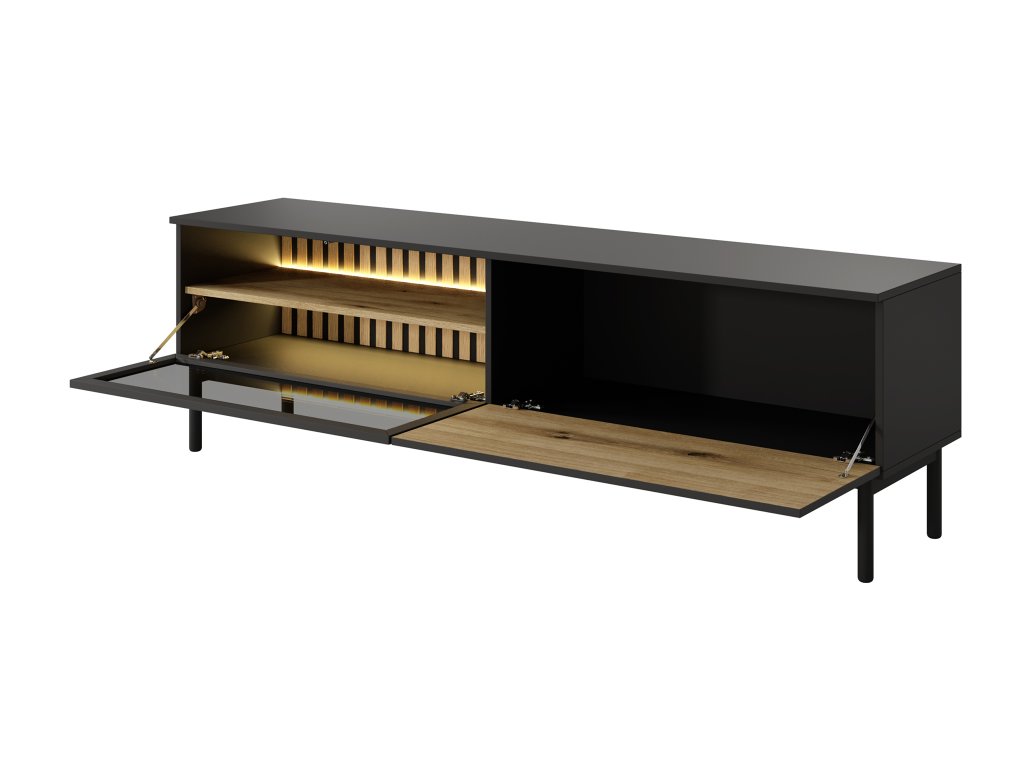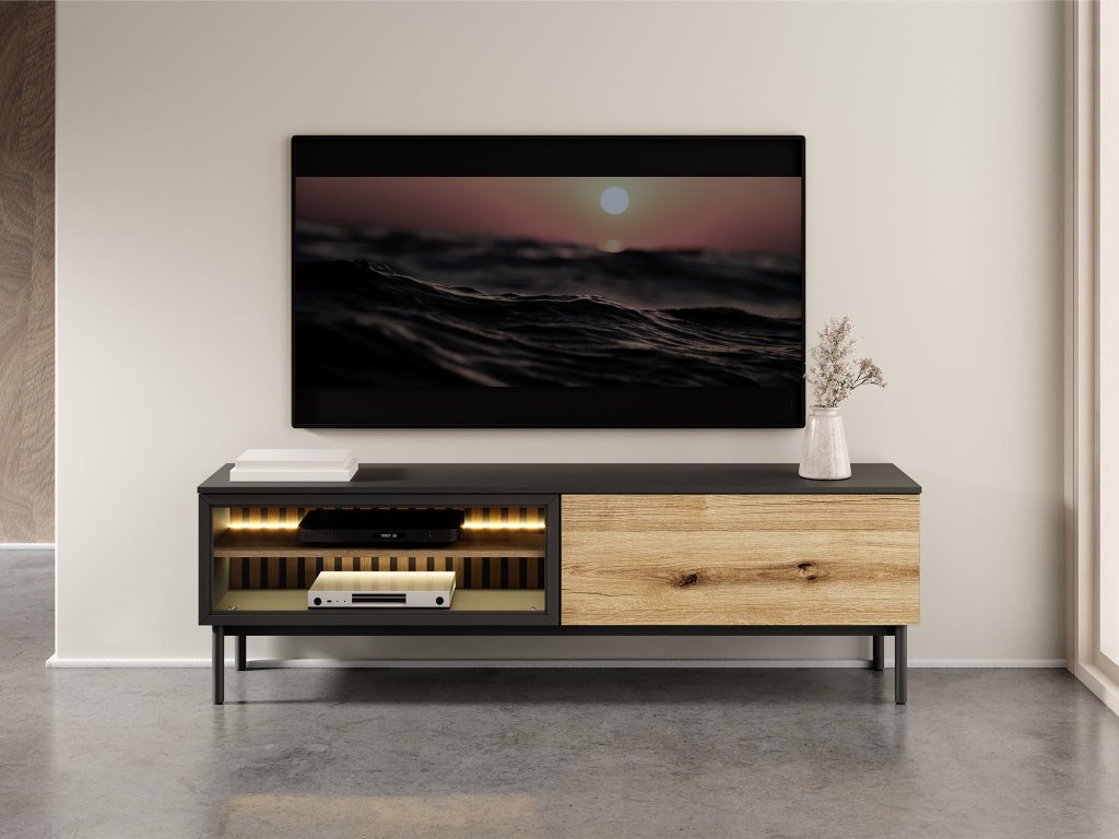 Televízny stolík 180 Lango kombinuje moderný dubový dekor s čiernymi akcentmi a poskytuje praktický úložný priestor pre médiá, konzoly či dekorácie. Presklené dvierka s LED osvetlením elegantne zvýraznia obsah a lamely na zadnej doske dodávajú stolíku štýlový vizuálny efekt. Je ideálny do priestrannej obývačky, kde spája funkčnosť s dizajnom a udržuje priestor prehľadný a elegantný.