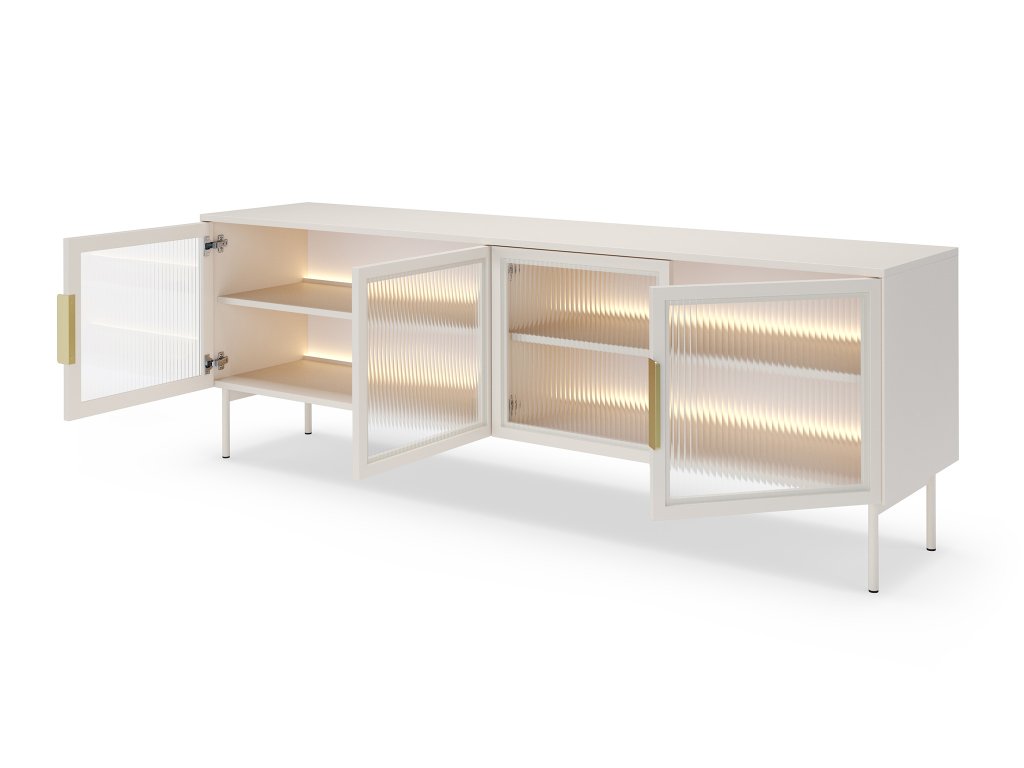 TV stolík LIMU v jemnom kašmírovom odtieni so štýlovými zlatými kovovými úchytkami je ideálnym riešením pre moderné obývacie priestory. Disponuje štvoricou dvierok a praktickými policami, ktoré poskytujú dostatok miesta na uloženie televízora, multimediálnych zariadení, kníh či dekorácií. Jemné línie a minimalistické detaily dodávajú stolíku luxusný a nadčasový charakter, ktorý sa ľahko integruje do akéhokoľvek interiéru.