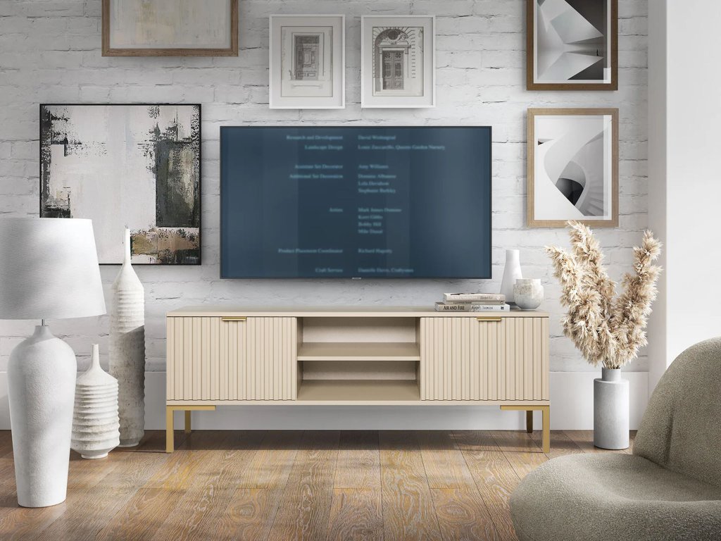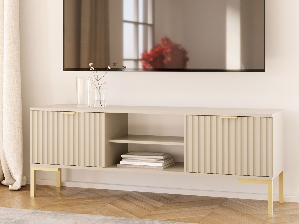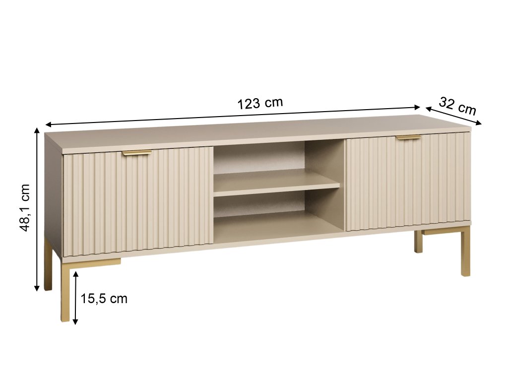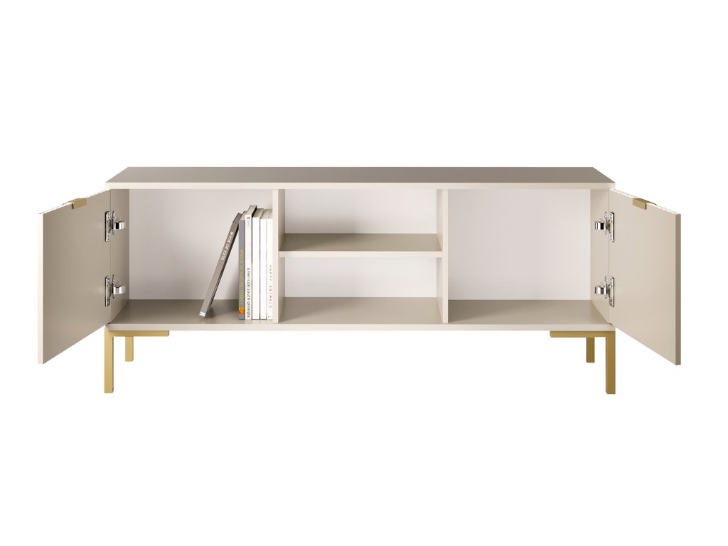 TV stolík Lumina v jemnom kašmírovom odtieni je ideálnou voľbou. Vyniká moderným dizajnom, nadčasovou farebnosťou a praktickým spracovaním, vďaka čomu sa ľahko prispôsobí rôznym štýlom bývania. Vďaka svojmu modernému dizajnu s čistými líniami sa hodí do rôznych štýlov zariadenia. Poskytuje praktickú otvorenú poličku, ktorá je ideálna na uloženie elektroniky či dekorácií. Dve uzavreté skrinky umožňujú uschovať všetko, čo potrebujete mať po ruke, no zároveň skryté pred pohľadom. Hliníkové úchytky v zlatej farbe dodávajú stolíku elegantný vzhľad a zabezpečujú pohodlné otváranie dvierok. Kvalitné spracovanie a pevná konštrukcia zaručujú dlhú životnosť a odolnosť voči každodennému používaniu.