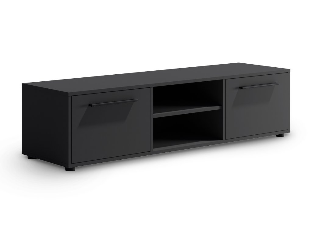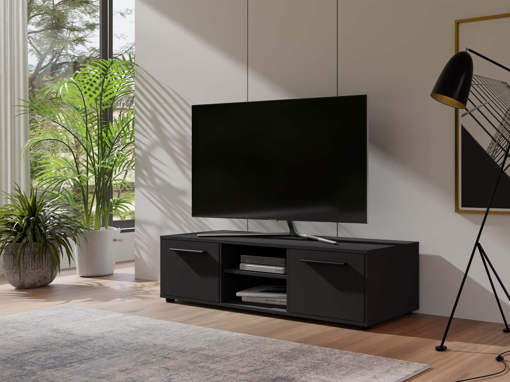 TV stolík Maxione s dĺžkou 150 cm v elegantnom čiernom prevedení vnesie do interiéru výrazný a moderný vzhľad. Nepôsobí len ako praktický stolík pod televízor, ale aj ako dizajnový prvok, ktorý podčiarkne charakter obývačky či spálne. Čierna farba dodáva priestoru hĺbku a moderný nádych, pričom sa jednoducho kombinuje s ostatným zariadením. Premyslené riešenie úložného priestoru v podobe bočných skriniek s výklopnými dvierkami a otvorenej police poskytuje ideálne miesto pre elektroniku, herné konzoly, ovládače aj dekorácie, aby všetko zostalo prehľadne usporiadané.