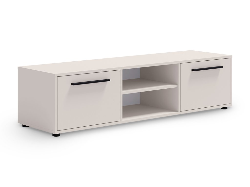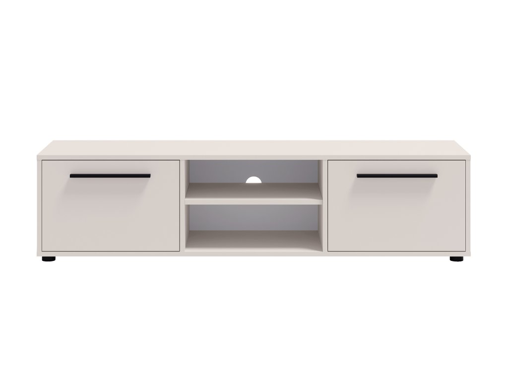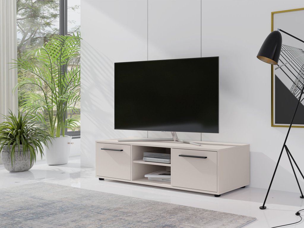TV stolík Maxione so šírkou 150 cm v sofistikovanej kašmírovej farbe vnáša do interiéru pokojný a vyvážený vzhľad. Tento neutrálny odtieň pôsobí teplo a harmonicky, vďaka čomu je ideálny do obývačky aj spálne. Stolík neslúži len ako stabilný podklad pre televízor, ale zároveň dotvára celkový štýl miestnosti a vytvára príjemnú atmosféru. Praktické usporiadanie bočných skriniek s výklopnými dvierkami dopĺňa otvorená polica, ktorá ponúka dostatok miesta na multimediálne zariadenia, príslušenstvo či dekorácie a pomáha udržať priestor prehľadný.