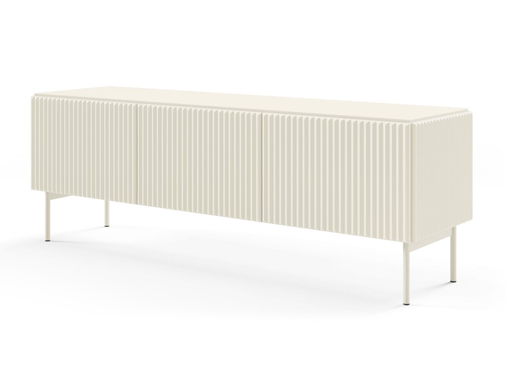 Menší TV stolík Muti F ponúka rovnaký elegantný a moderný dizajn ako väčší model, no v kompaktnej veľkosti, ideálnej do menších obývačiek či bytov. Svetlé prevedenie pôsobí nadčasovo a sofistikovane, zatiaľ čo drážkované čelá a čisté línie dodávajú stolíku luxusný charakter. Praktické zásuvky a dvierka s policami poskytujú dostatok úložného priestoru pre televízne príslušenstvo a drobnosti, pričom zachovávajú prehľadný a štýlový vzhľad. Tento RTV stolík sa skvele hodí pod televízor a prirodzene zapadne do akejkoľvek obývačky. Stolík ponúka tri priestranné zásuvky, vhodné na príslušenstvo k TV, káble či drobnosti, ktoré chcete mať usporiadané. Dvoje dvierka s policami poskytujú miesto pre herné konzoly, set-top boxy, dekorácie alebo ďalšie potrebné predmety. Vďaka praktickému členeniu získate dostatok úložného priestoru bez vizuálneho chaosu. Minimalistický vzhľad podčiarkuje push-to-open systém, ktorý eliminuje potrebu úchytiek, a stolík tak pôsobí čistým, moderným dojmom. Stabilitu a vzdušnosť celej konštrukcie zabezpečujú štíhle kovové nohy, ktoré zároveň uľahčujú upratovanie pod nábytkom.