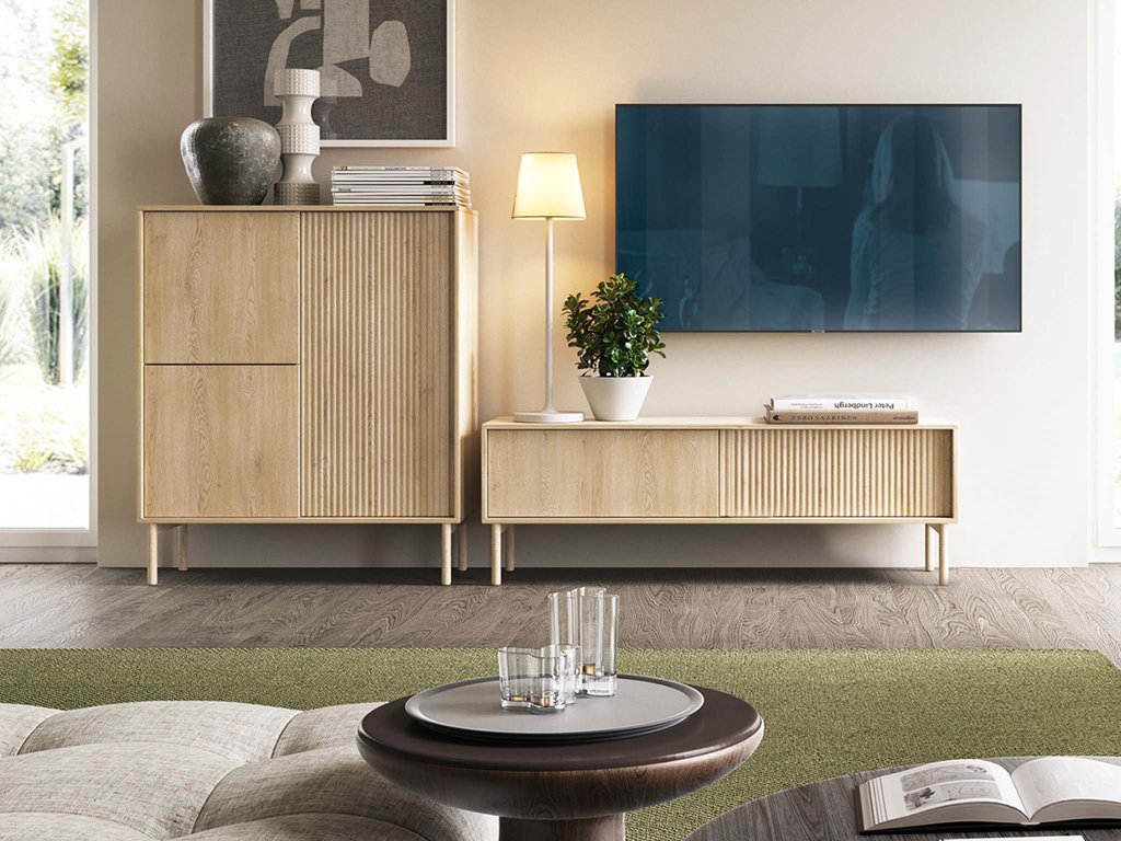 Kolekcia do obývačky TAVO prináša moderný dizajn v elegantnom odtieni dub cremona, ktorý vytvára v interiéri teplú a prirodzenú atmosféru. Každý kus nábytku je vyrobený z kvalitných materiálov a doplnený o štýlové drevené nožičky či výrazné drážkované predné strany, ktoré dodávajú kolekcii jedinečný a nadčasový vzhľad. Kolekcia obsahuje vysokú komodu, dve komody v rôznych veľkostiach, TV stolík v niekoľkých variantoch a nočný stolík, vďaka čomu si môžete vytvoriť harmonický a funkčný priestor presne podľa svojich predstáv. Stačí už len pridať vašu pohodlnú sedaciu súpravu.