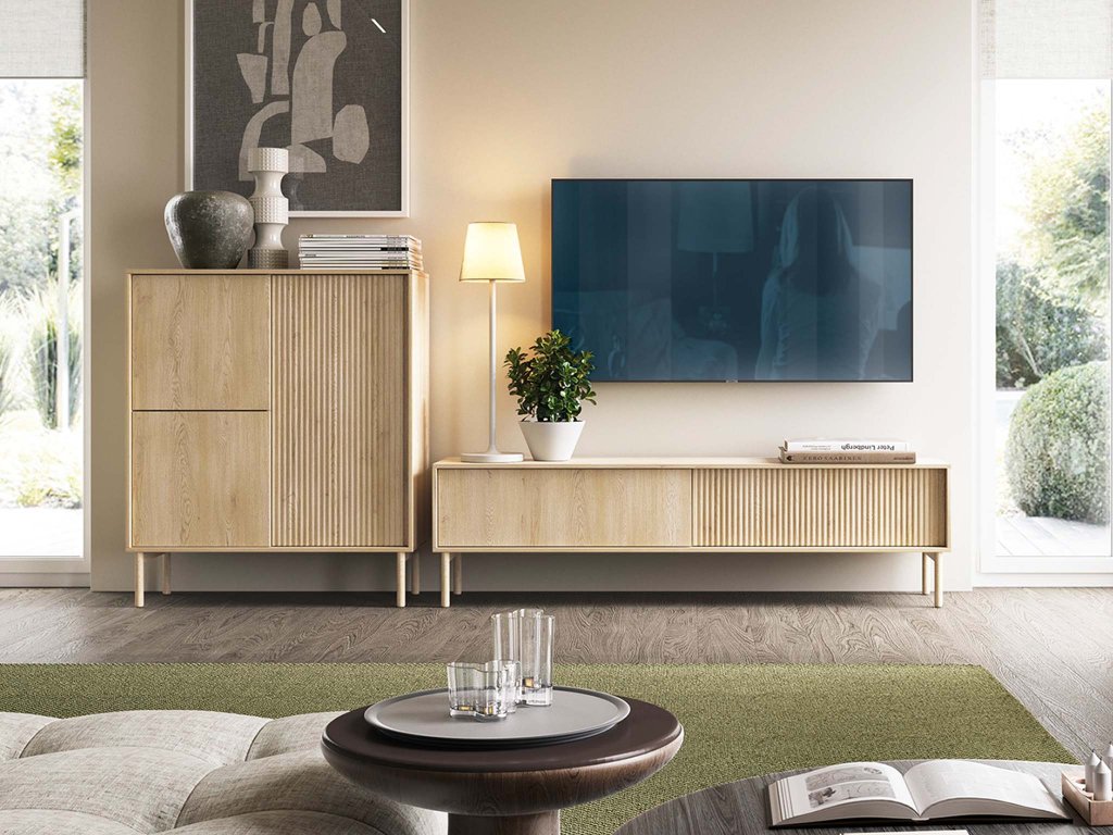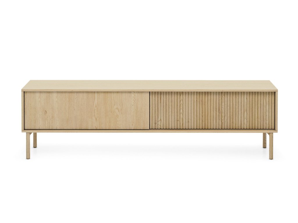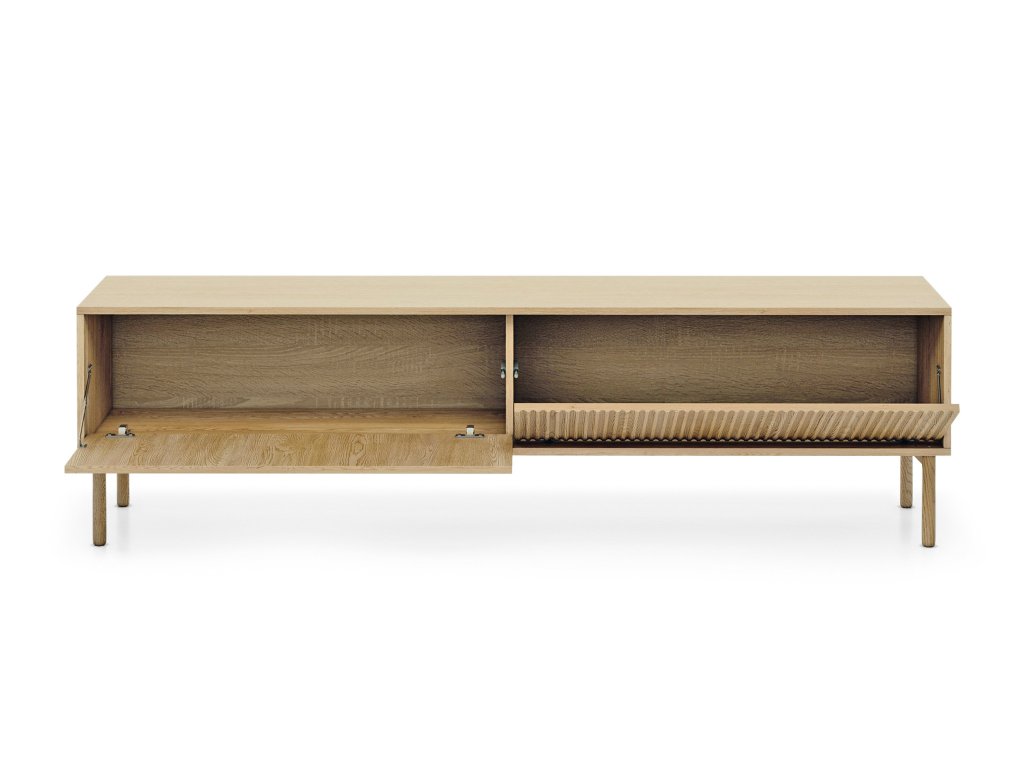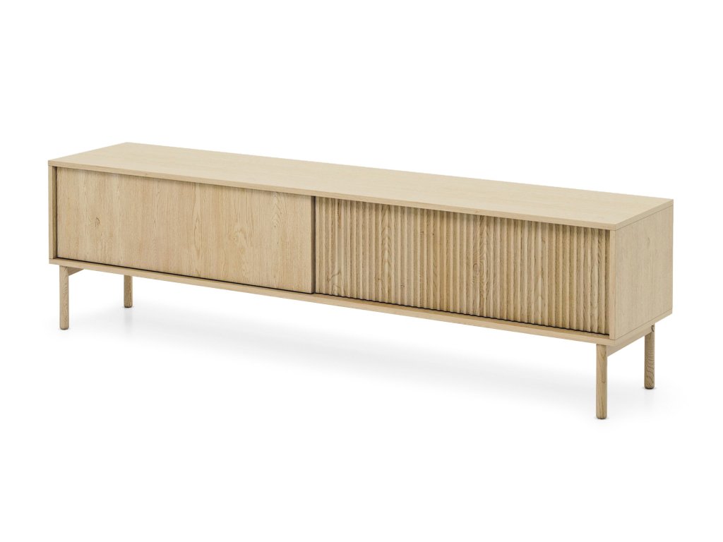 TV stolík Tavo s dĺžkou 187 cm pôsobí ako funkčný aj vizuálne zaujímavý doplnok obývačky. Jeho pevná konštrukcia na vyšších nožičkách z masívneho dreva mu poskytuje stabilitu a zároveň pomáha udržať priestor pod nábytkom čistý. Predná plocha je vyrobená z MDF materiálu, ktorému dodávajú odolnosť a eleganciu kvalitne spracované ABS hrany. Charakteristické vzorované dvierka zároveň pôsobia ako decentný dizajnový prvok.