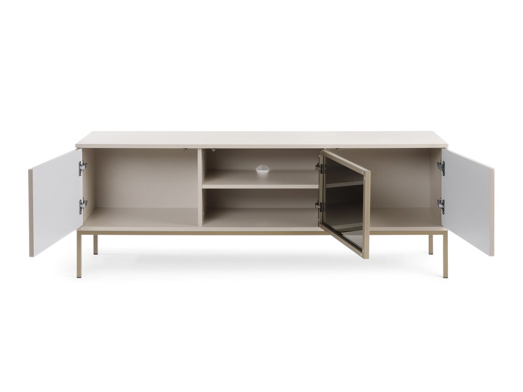 Moderná elegancia v jemnom kašmírovom odtieni. TV Stolík Sento opticky zväčší a presvetlí vašu obývačku. Poskytuje stabilné miesto pre veľké obrazovky. Centrálna presklená priehradka s LED osvetlením dokonale poslúži na umiestnenie set-top boxu, hernej konzoly alebo na efektívne vystavenie dekoračných predmetov. Ideálny pre útulný a vzdušný interiér.